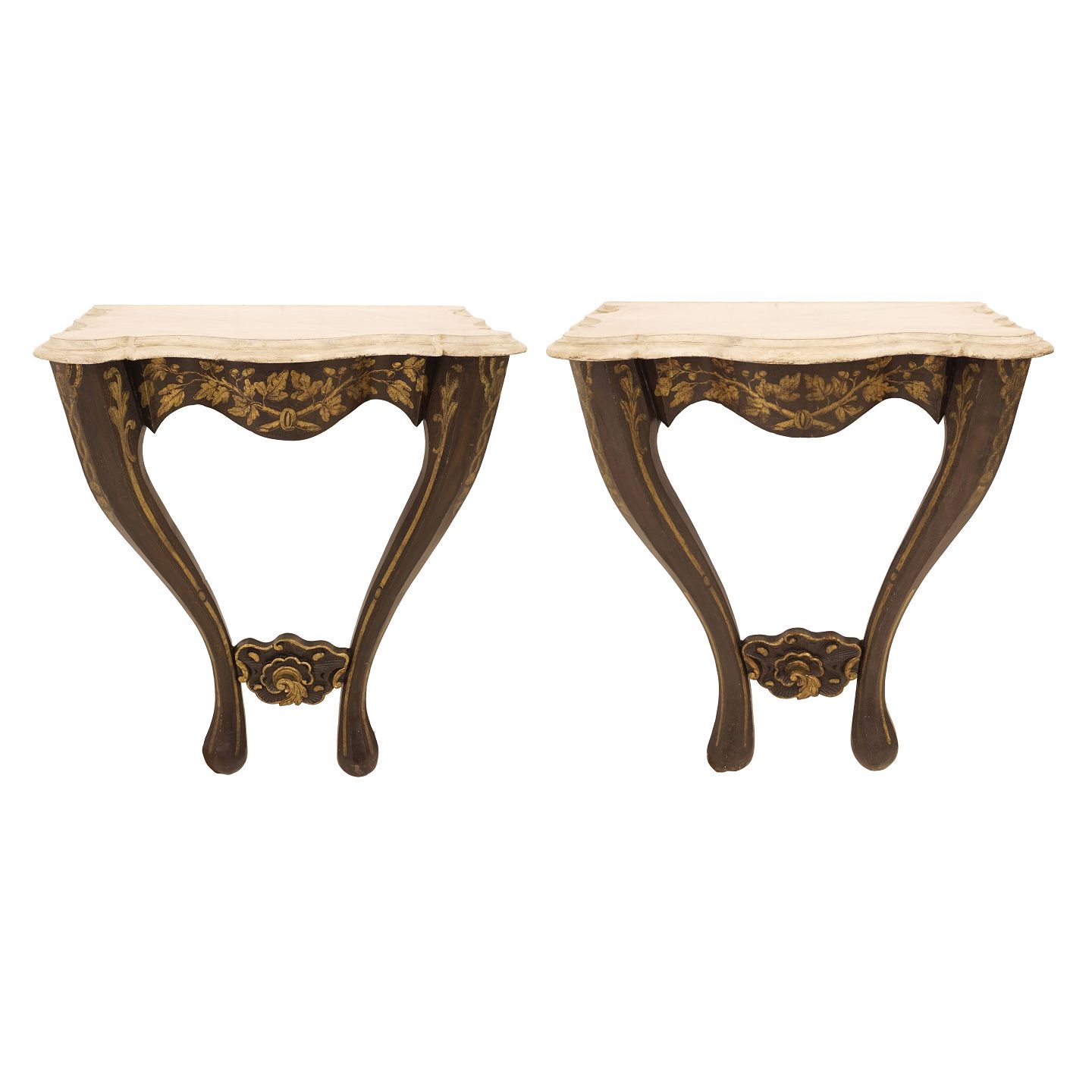 Pair of partly gilt Rococostyle console table with imitated marble wooden tops