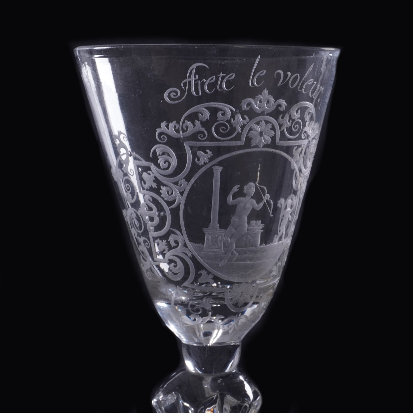 Glaspokal med graveringen "Arete le Voleur"