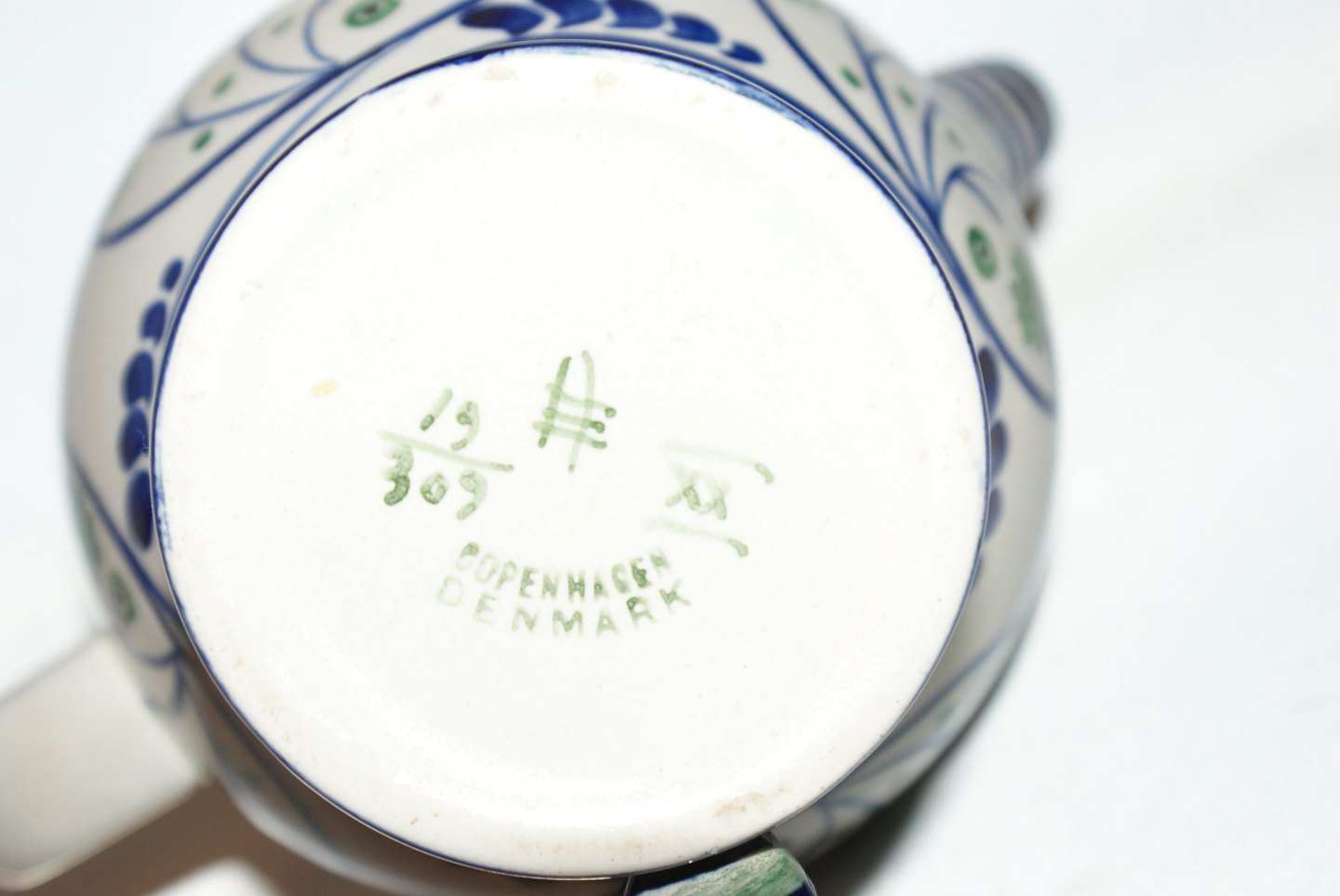Aluminia Stel-A Chokoladekande med 2 hanke. Dekoration 19 Tang og Søstjerner 1902 Design: H. Slot-Møller (1864-1937) Dekorationsnummer 19-309 Højde 26,5 cm. Flot velholdt stand