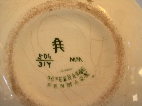 Aluminia Bowl, diameter 15 cm, height 5.5 cm. Hairline crack in top. Decoration number 506/314. In the 1880s when production at the Royal Copenhagen factory was dropping to a dangerously low level they were taken over by Aluminia (founded 1863), successful makers of earthenware, and since that time the two ranges, earthenware and porcelain, have been running in tandem.