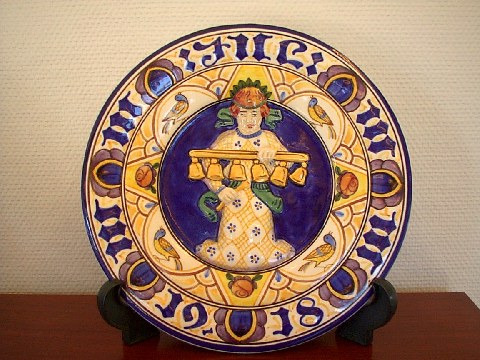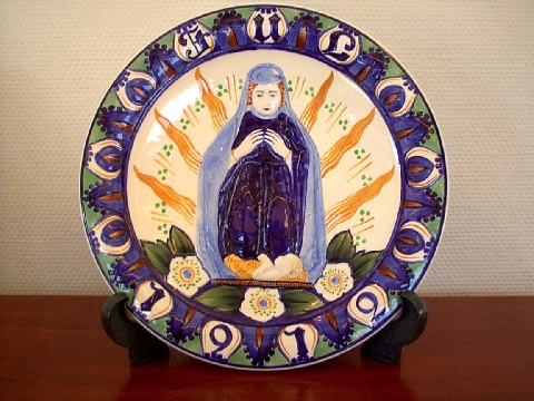 To meget Flotte og Store Aluminia Julerelieffer. Diameter 30 cm. Til venstre Engel med klokkespil fra 1918. Den har nummer 1154/1020. Udført af R. Harboe. Til højre Maria tilbeder Barnet fra 1912. Den har nummer 860/733 udført af R. Harboe. Denne er SOLGT. Begge er i meget flot stand. Flere årgange haves på lager.