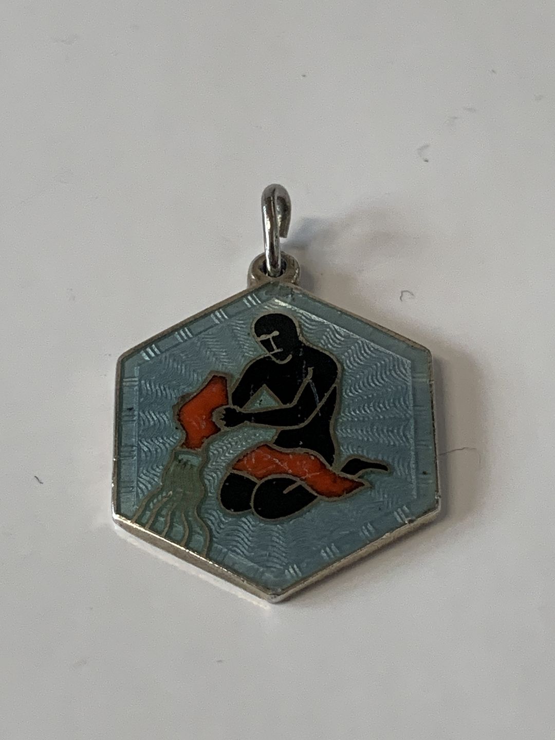 Vandmanden stjernetegn Vedhæng med emalje i sterling sølv. Stemplet: 925s. Højde med øsken: 2,8 cm. Bredde: 2 cm. Se i øvrigt vores store udvalg af vedhæng her: https://www.antikhuset.net/katindex.asp?kukat=12179