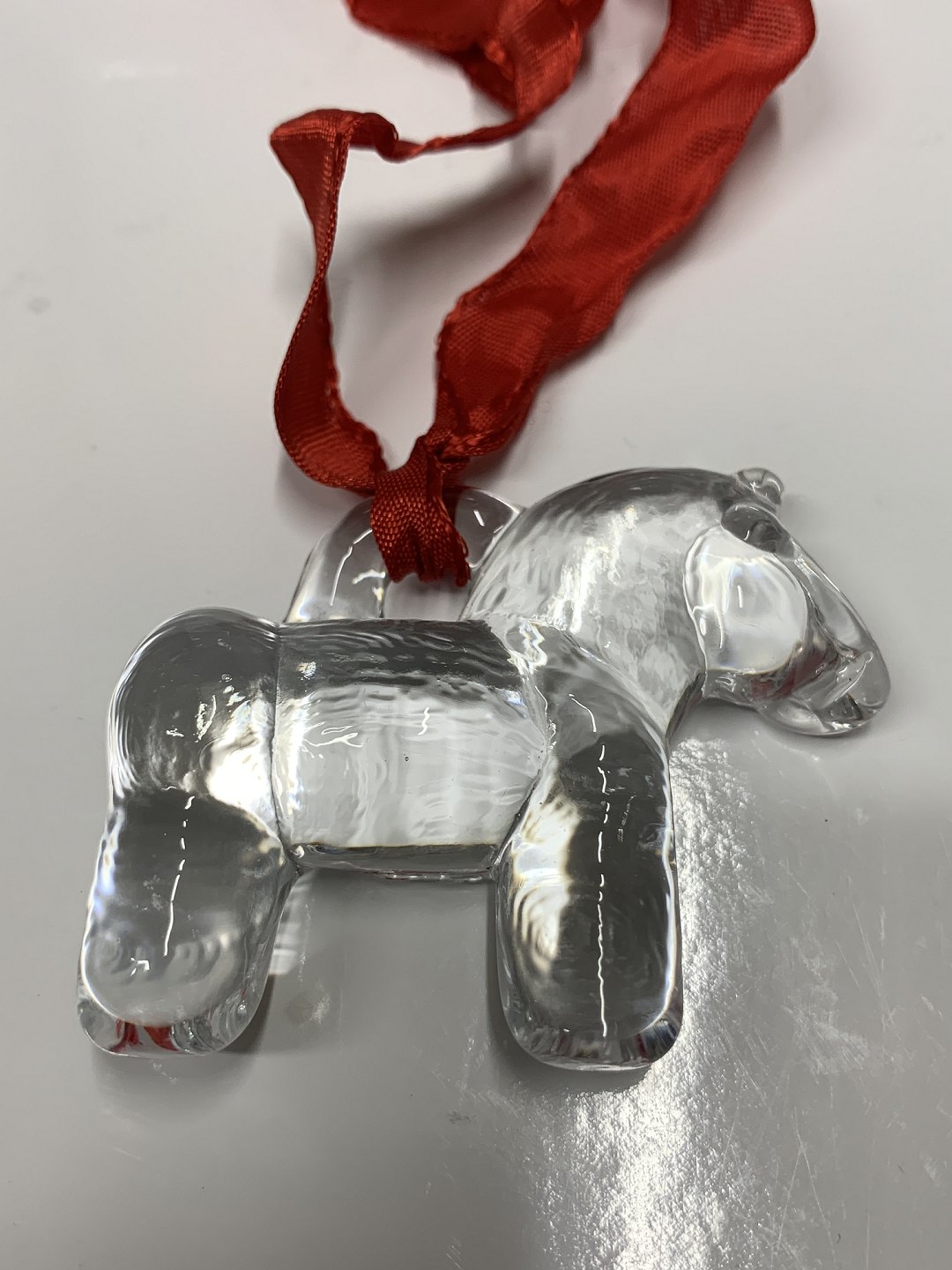Super nice Christmas hanging in glass, designed by Bertil Vallien for Kosta Boda. Hang the cute horse on the Christmas tree, a branch, in the window or down from the ceiling. It appears in beautiful and complete condition.