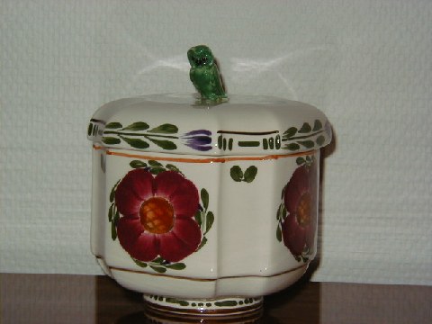 Aluminia Bonbonniere with a figurine of an owl, number 491/316, height 15 cm., top measures 13 by 13 cm. The lid has a crack.