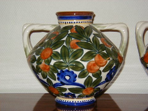 Two Large Aluminia Vases with beautiful decorations, number 740/512, height 24.5 cm., length 27 cm. Excellent condition.