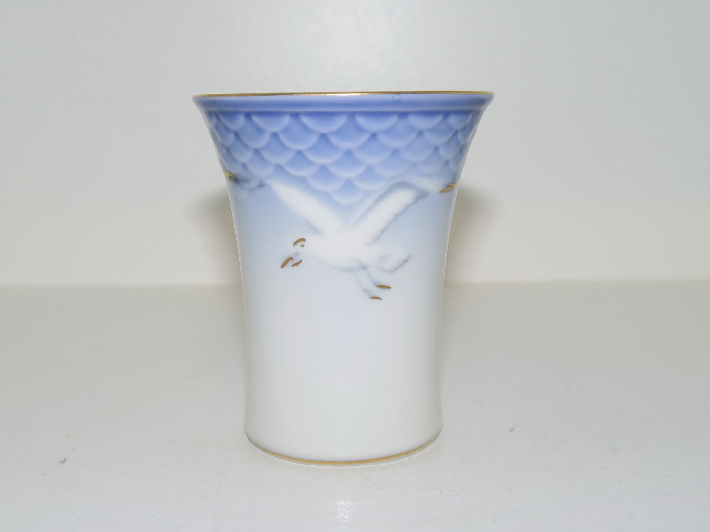 Bing & Grøndahl Måge med guldkant, lille kuvertvase. Dekorationsnummer 207 eller nyere nummer 672. 1. sortering. Højde 7,0 cm. Perfekt stand uden fejl.