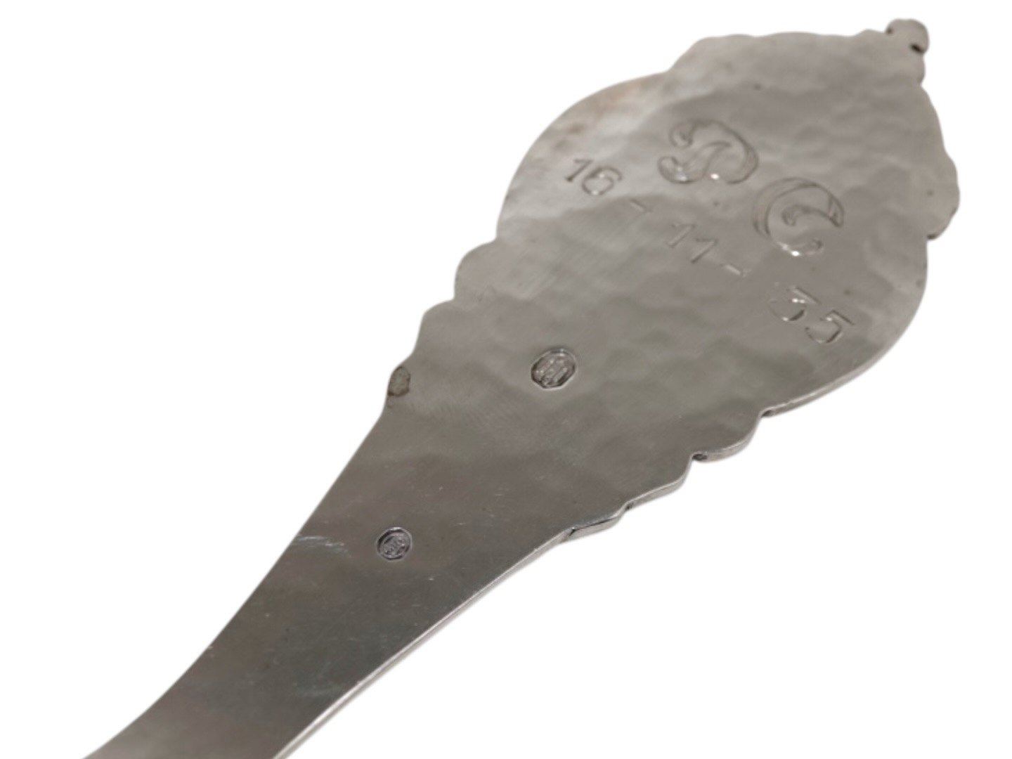 Stor sølv mindeske fra 1919 med teksten "Fædrearv værnedes til egn tarv". Længde 18,5 cm. Der er en indgravering fra 1935 på bagsiden, se foto, eller fin og velholdt stand.
