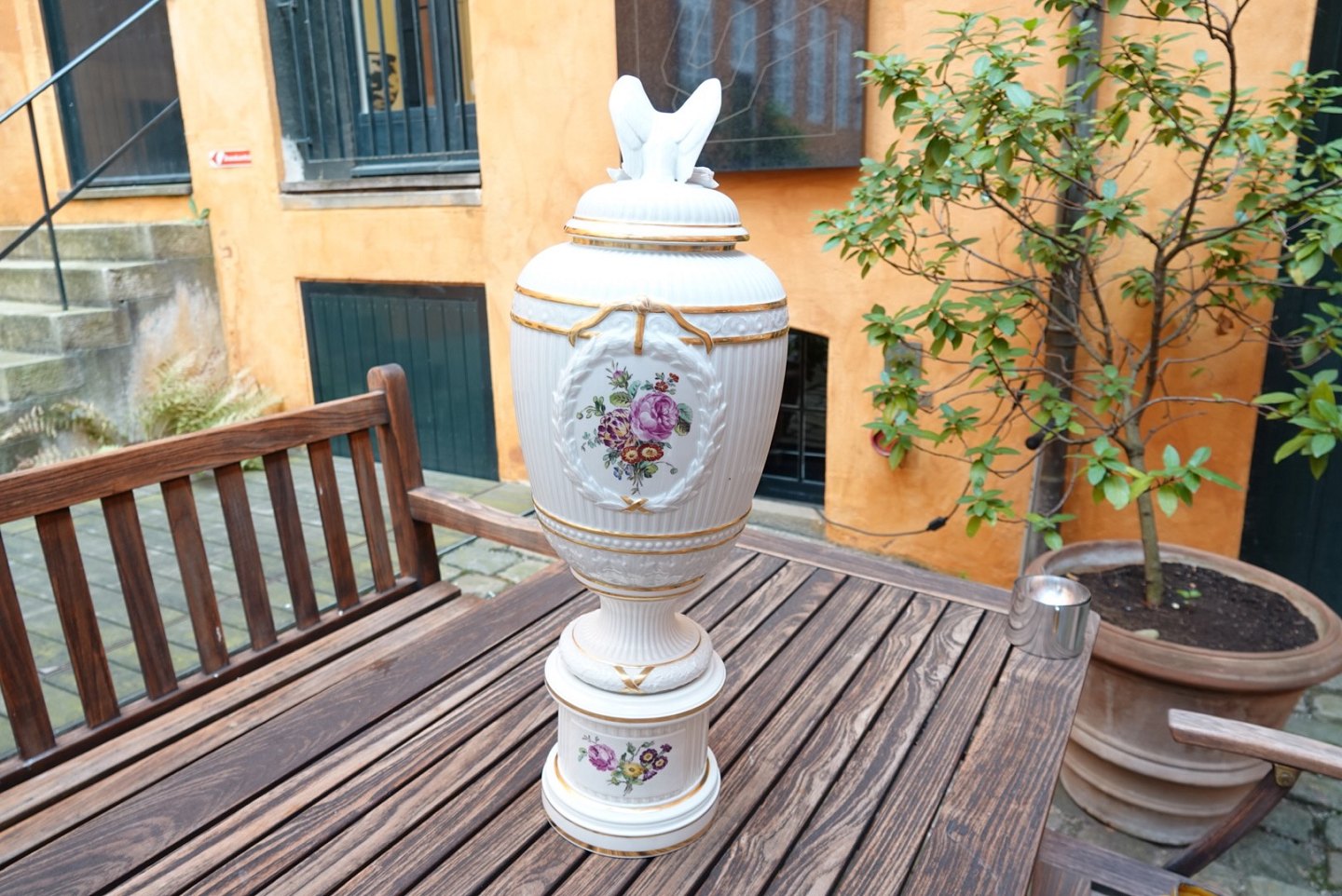 Enormous lidded jar with eagle on top
