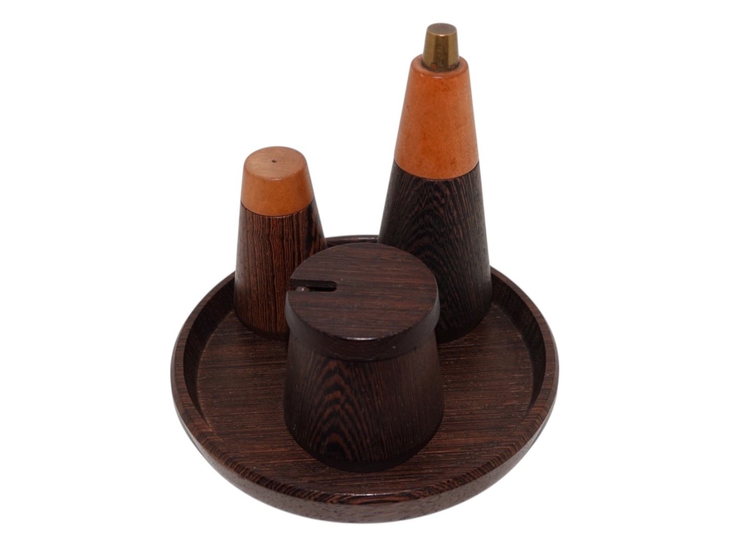 Dansk design, Plat de menage med udført i wenge træ, ahorn samt messing. Der er peberkværn, saltbøsse og sennepskrukke med glasindsats.