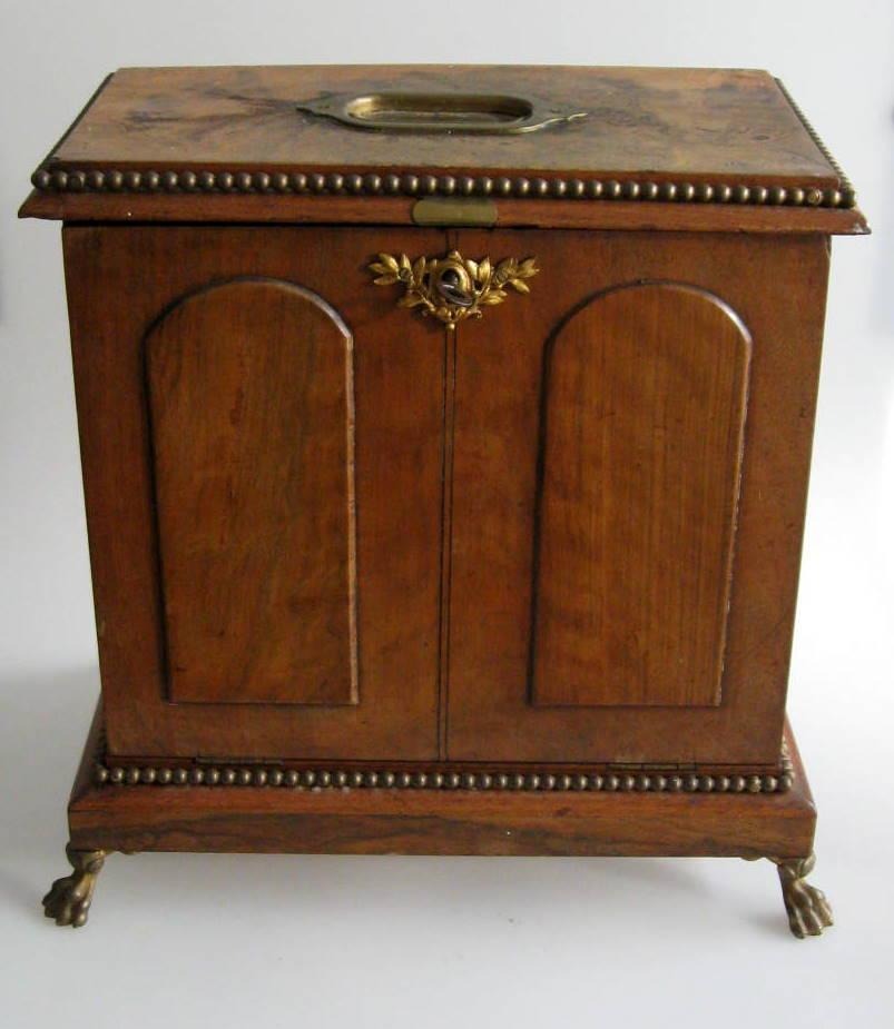 Engelsk skriveskrin, 19. årh. Valnød. Med messingmontering, løveben og hank. Med låge med dekorationer og lås. Indvendig med flere hylder og rum. H.: 29 cm. B.: 28 cm. D.: 18 cm.