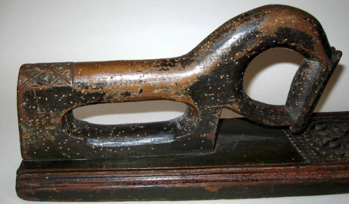 Dansk manglebræt, 19. årh. Med hestegreb og karvskæringer. Dateret 1824. Grøn- og rødmalet. L.: 61 cm. Med reparation. Proveniens.: Østjylland.