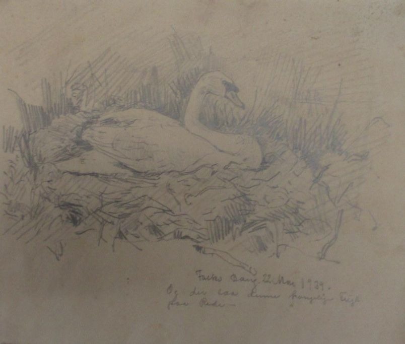 Bang, Falke (1912 - 1998) Danmark: En svane på reden. Bly på papir. Signeret: Falke Bang, 22. Maj 1939. 16,5 x 20 cm. Med tekst: "Og da laa denne kongelige Fugl paa Rede". Uindrammet.