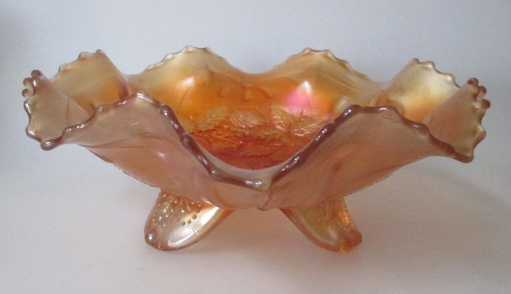 Amerikansk presset glas skål, orange irriseret, 20. årh. Dekoreret med blad og kirse bær. Flæset kant. Dia.: 22 cm. H.: 8,5 cm.   Perfekt stand!