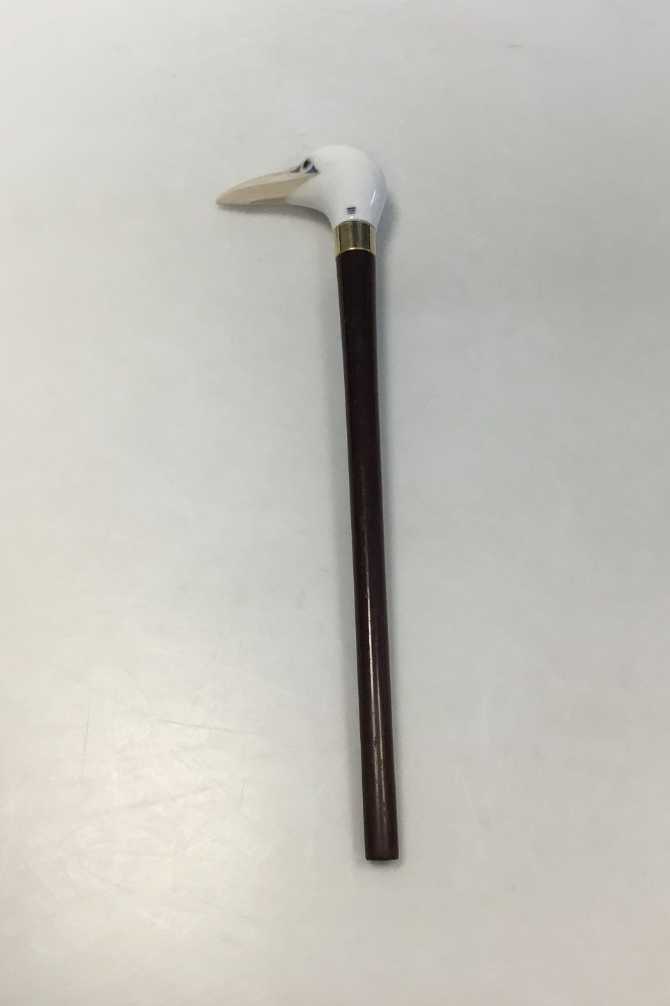 Royal Copenhagen Porcelain Walking Stick Handle made as a bird's head mounted on a short wooden stick. Stick with thread at the bottom. Measures 34 cm, Bird's head measures 9 cm. Bird's head with a crack