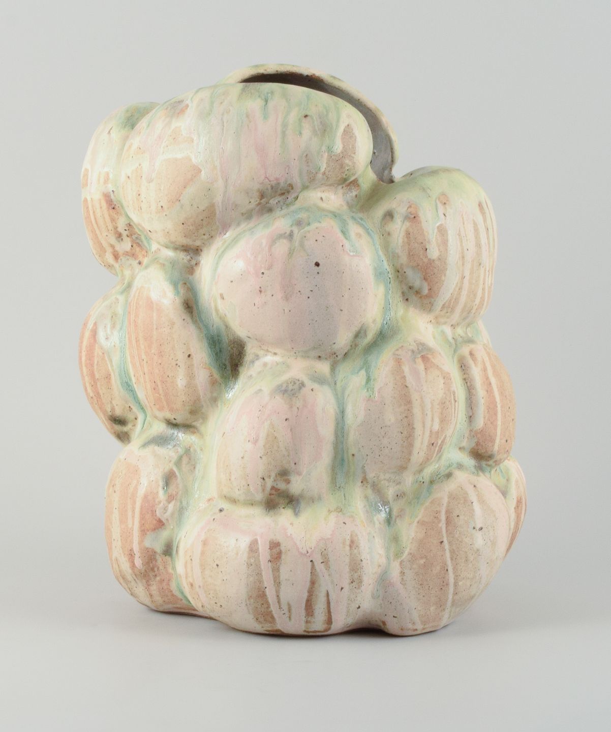 Monumental organically shaped vase. This piece is covered in multicolored pastel glaze, the clay showing between glaze runs.