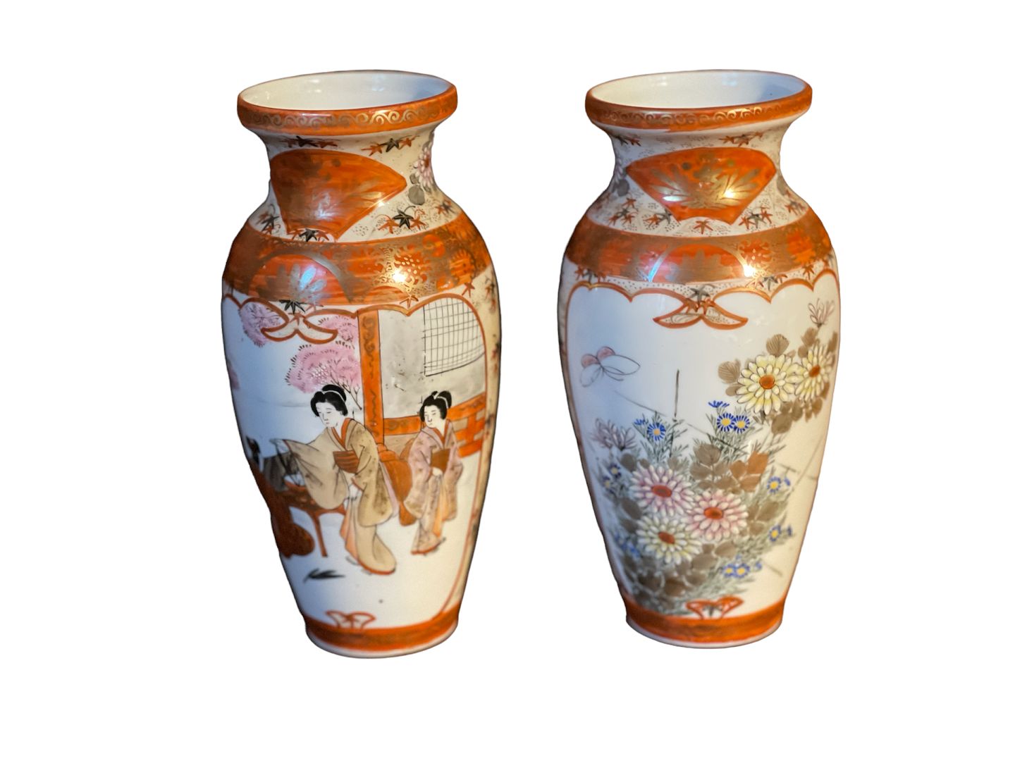 Pair of Japanese Kutani vases decorated in orange and gold panels with motifs of garden scenes with women in kimono and flowers on the reverse. Butterflies and cherry trees. Signed.