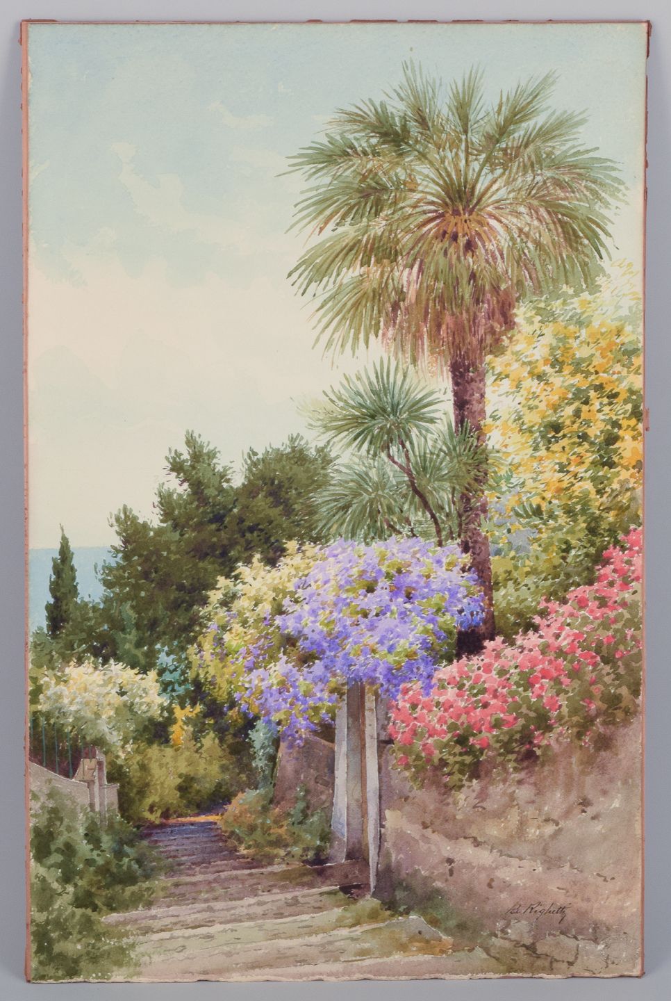 B. Righetti, Italian artist. Watercolor on paper. Southern park scene with a view of the sea.