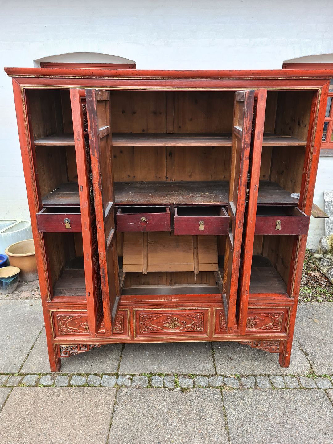 Kinesisk dækketøjsskab i original rød bemalet træ.