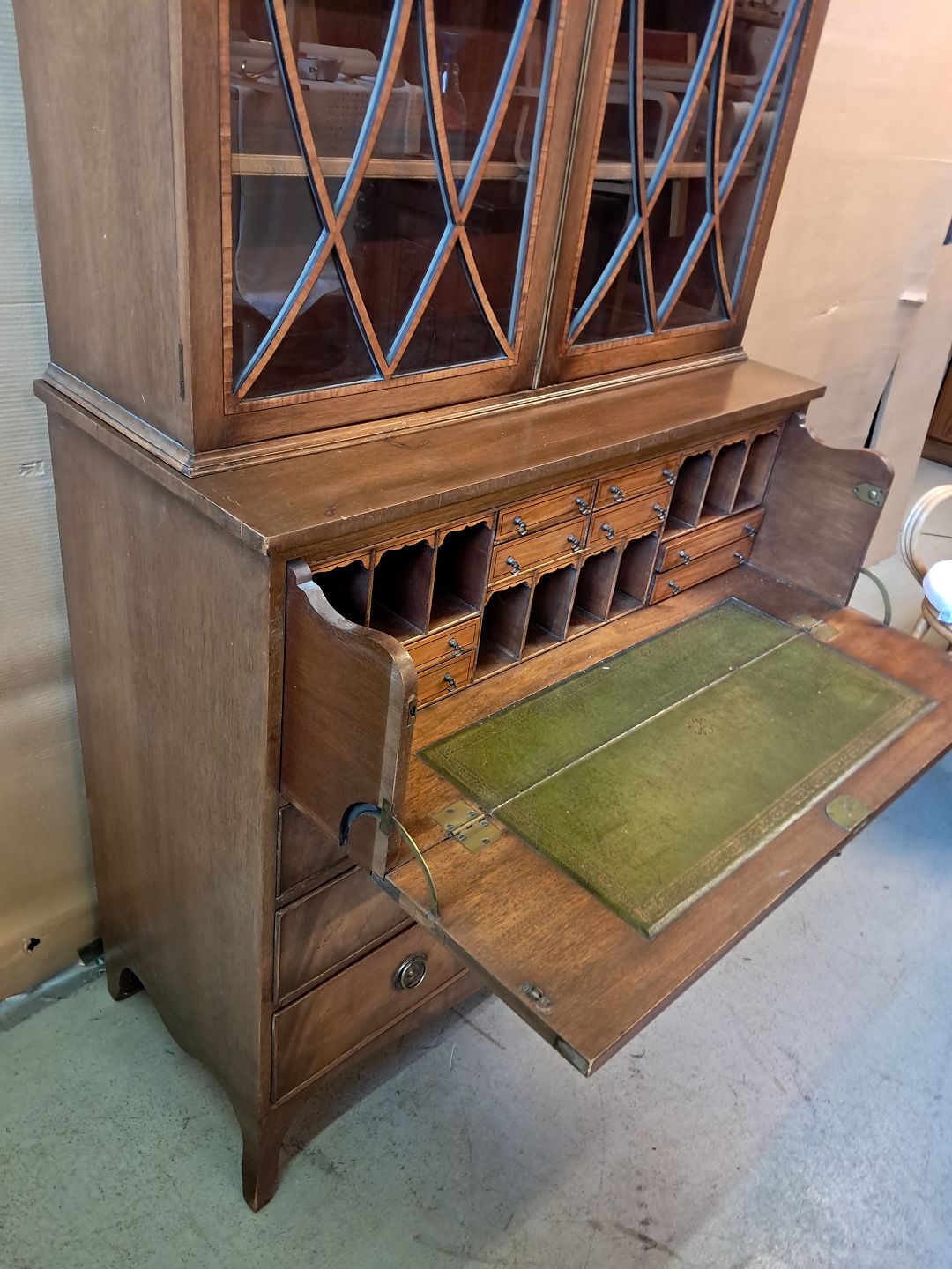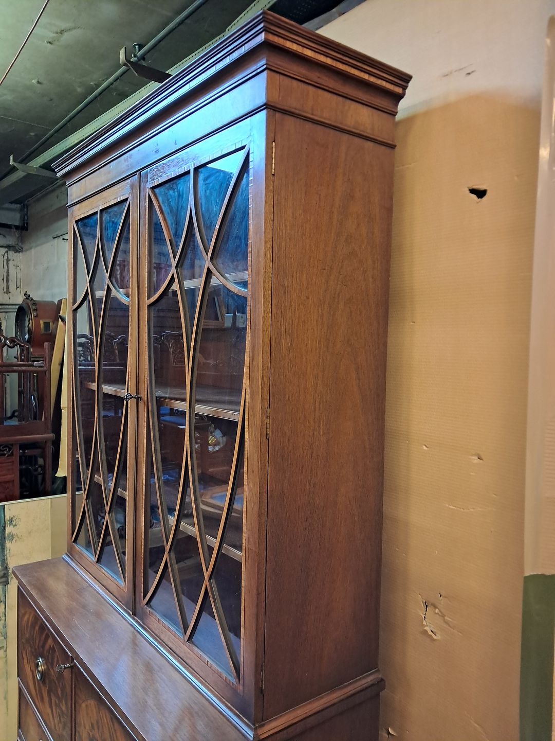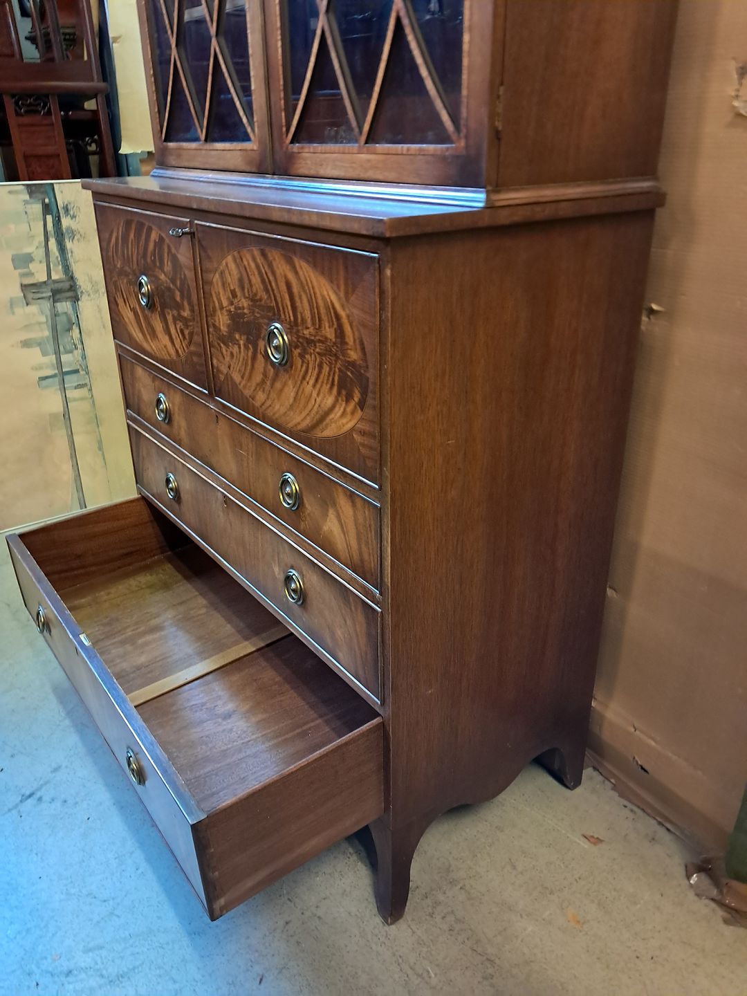 Engelsk skuffemøbel i fineret mahogni med vitrineoverdel, fra 1980erne.