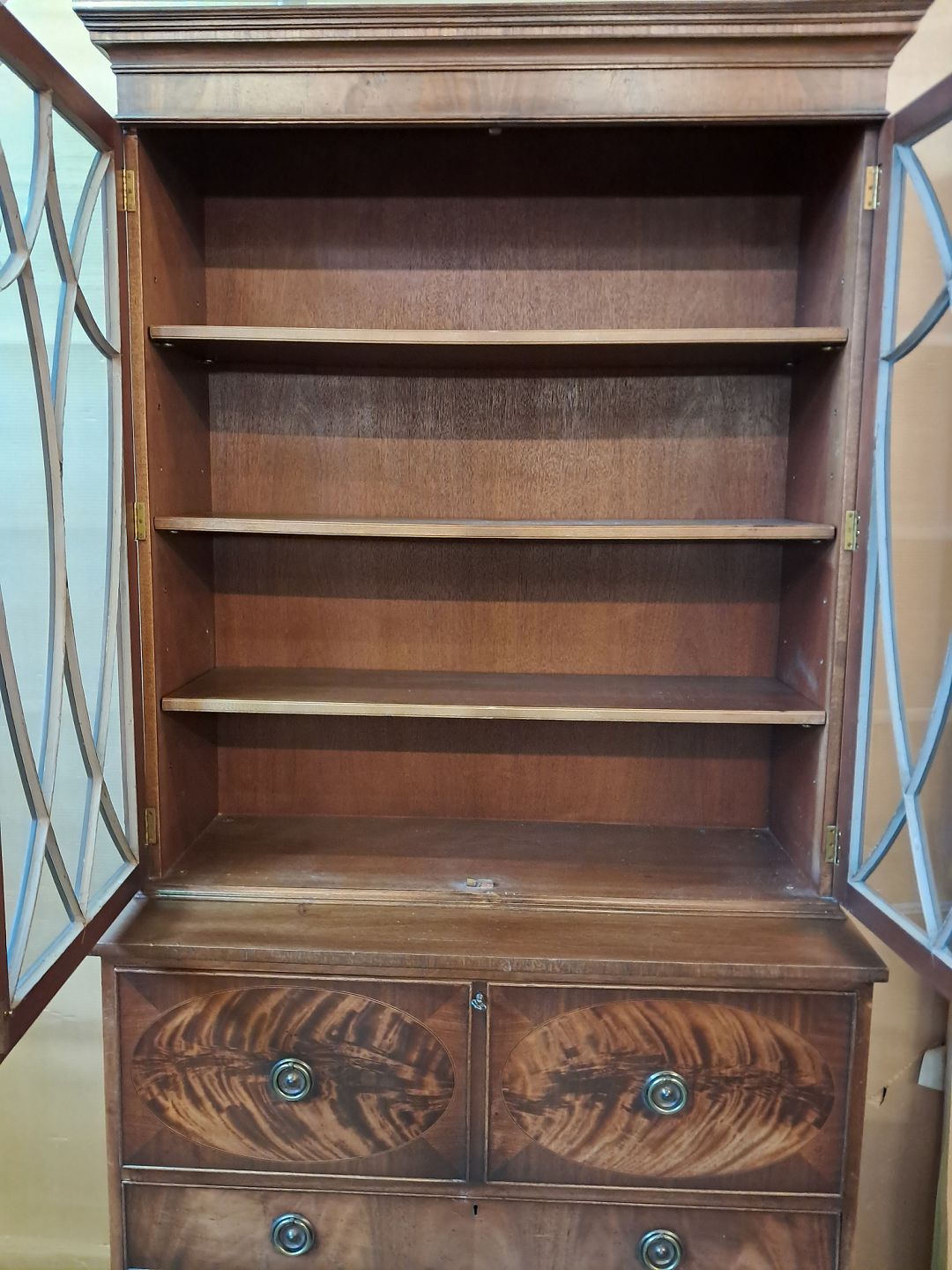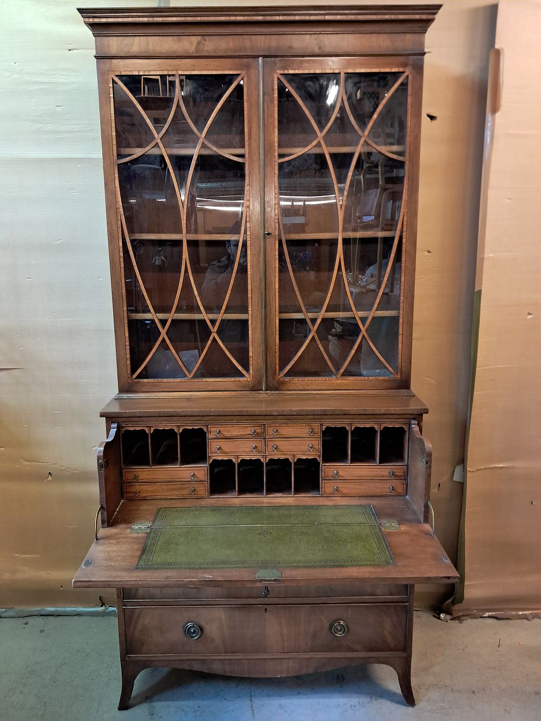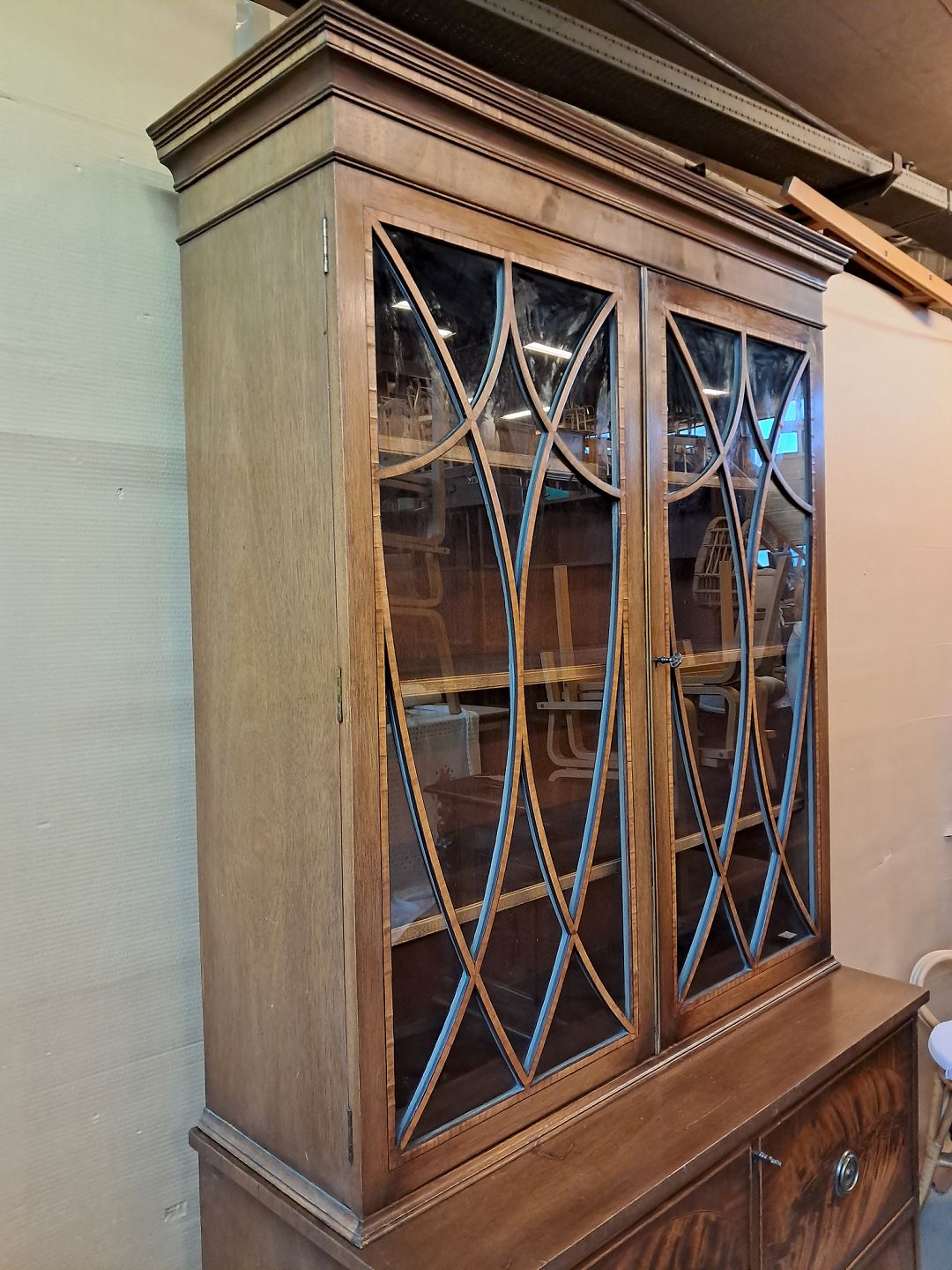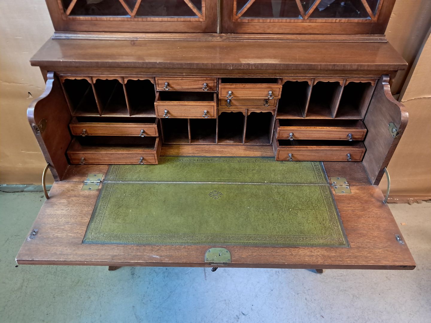 Engelsk skuffemøbel i fineret mahogni med vitrineoverdel, fra 1980erne.