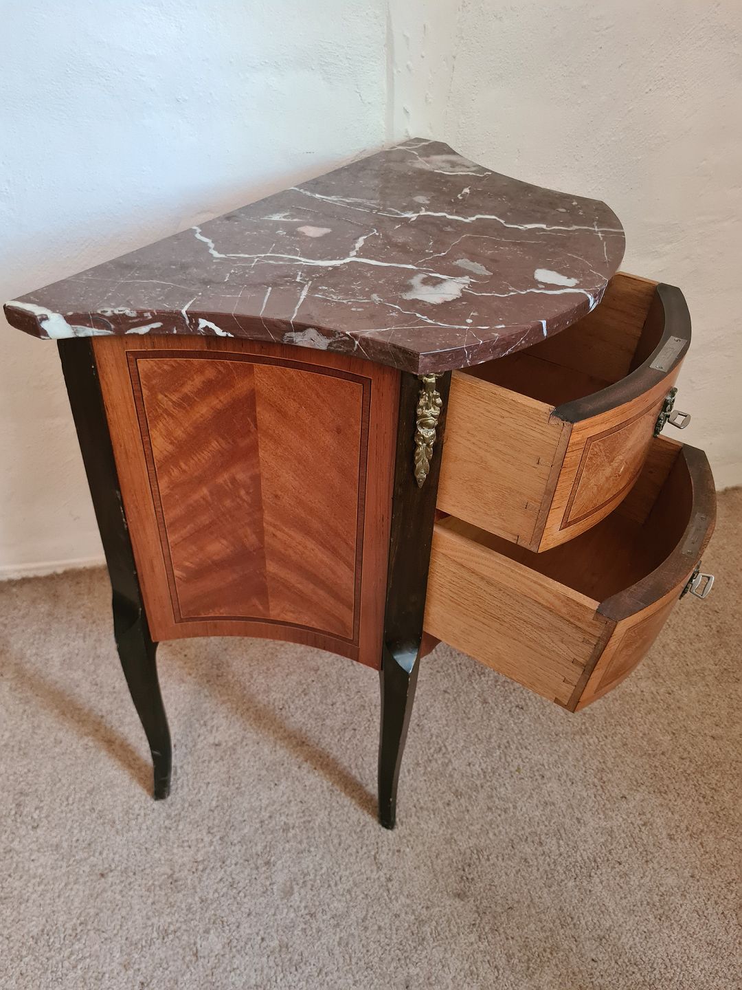 Kommode fra 1950'erne i finéret mahogni med marmor plade. Fremstår pæn og velholdt uden de store brugsspor. Dog mangler messingsko på venstre forben. (Billede)
