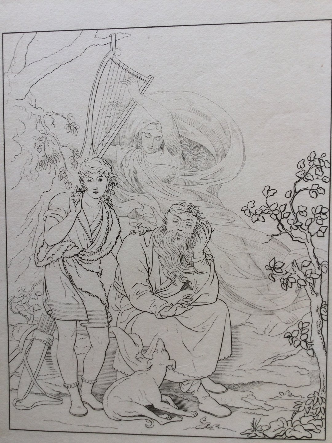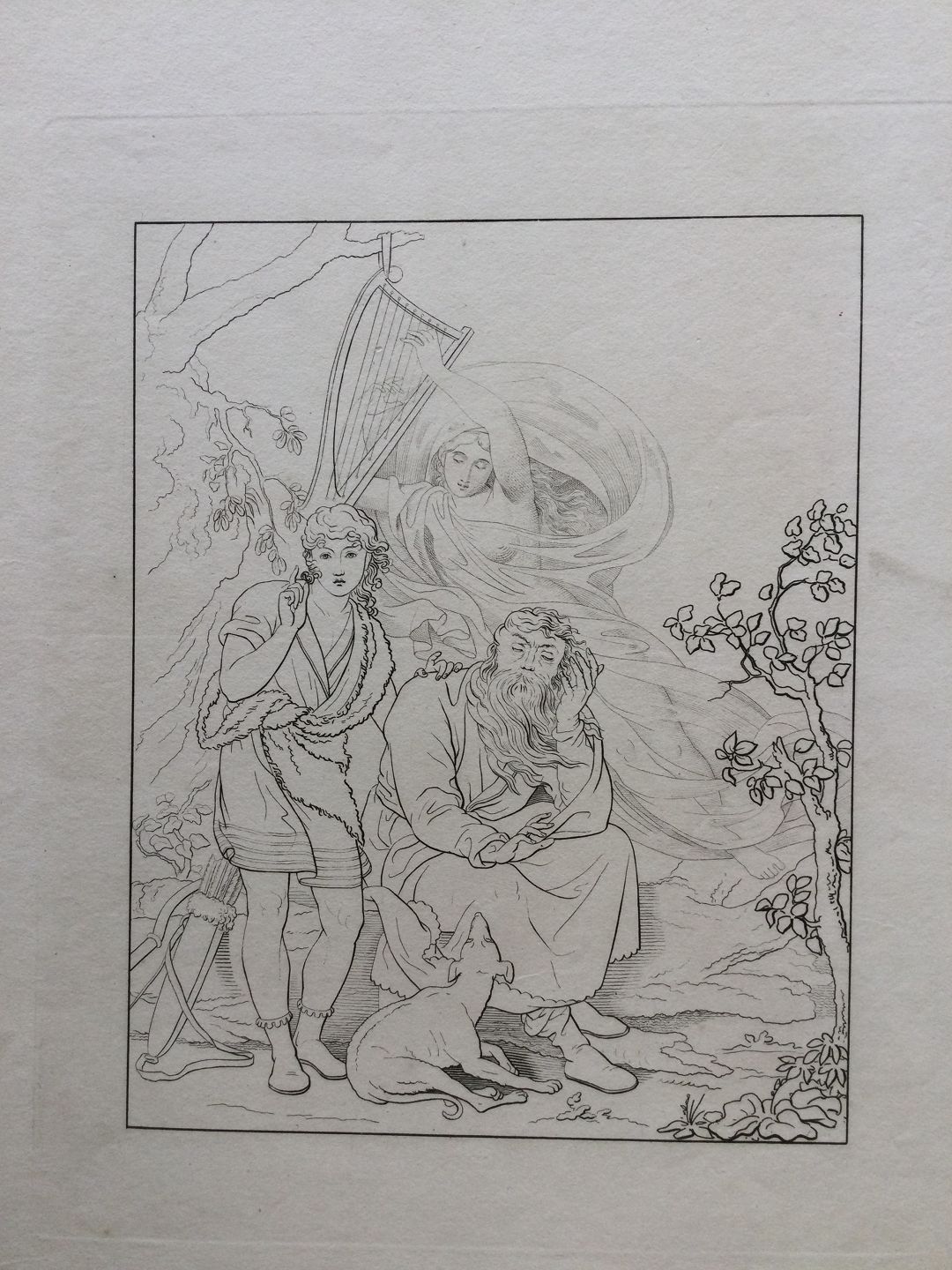 Radering efter C.G. Kratzenstein-Stubs "Ossian og Alpins Søn hører Malvinas Ånd gribe i Harpens Strenge" fra 1815.
