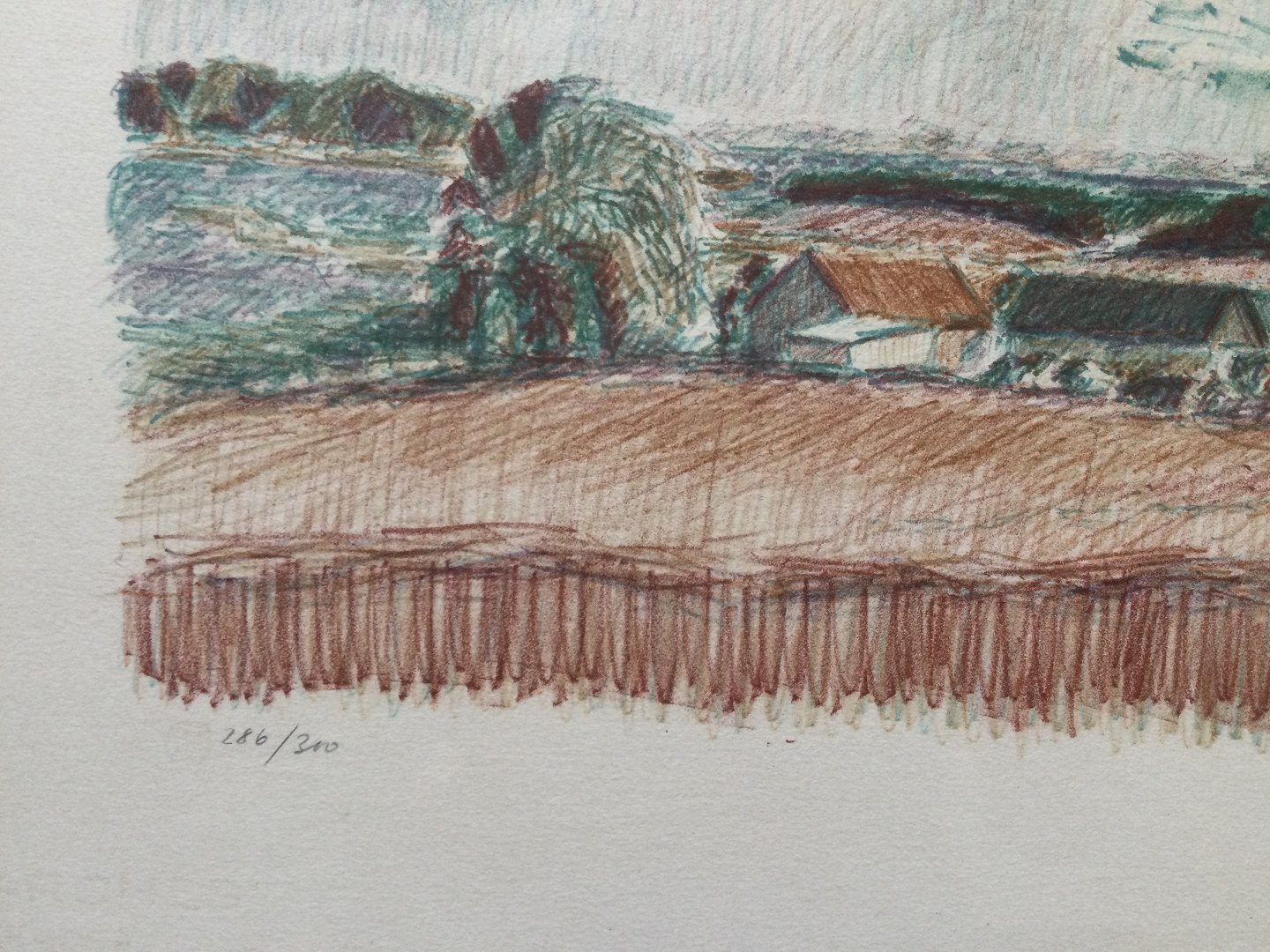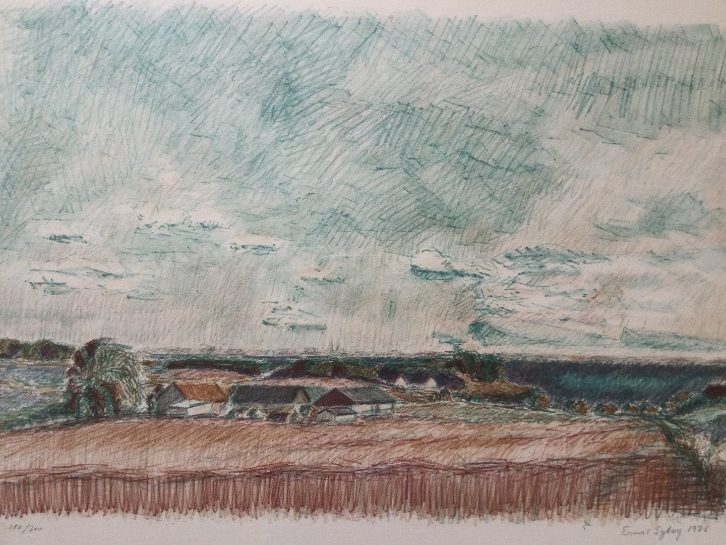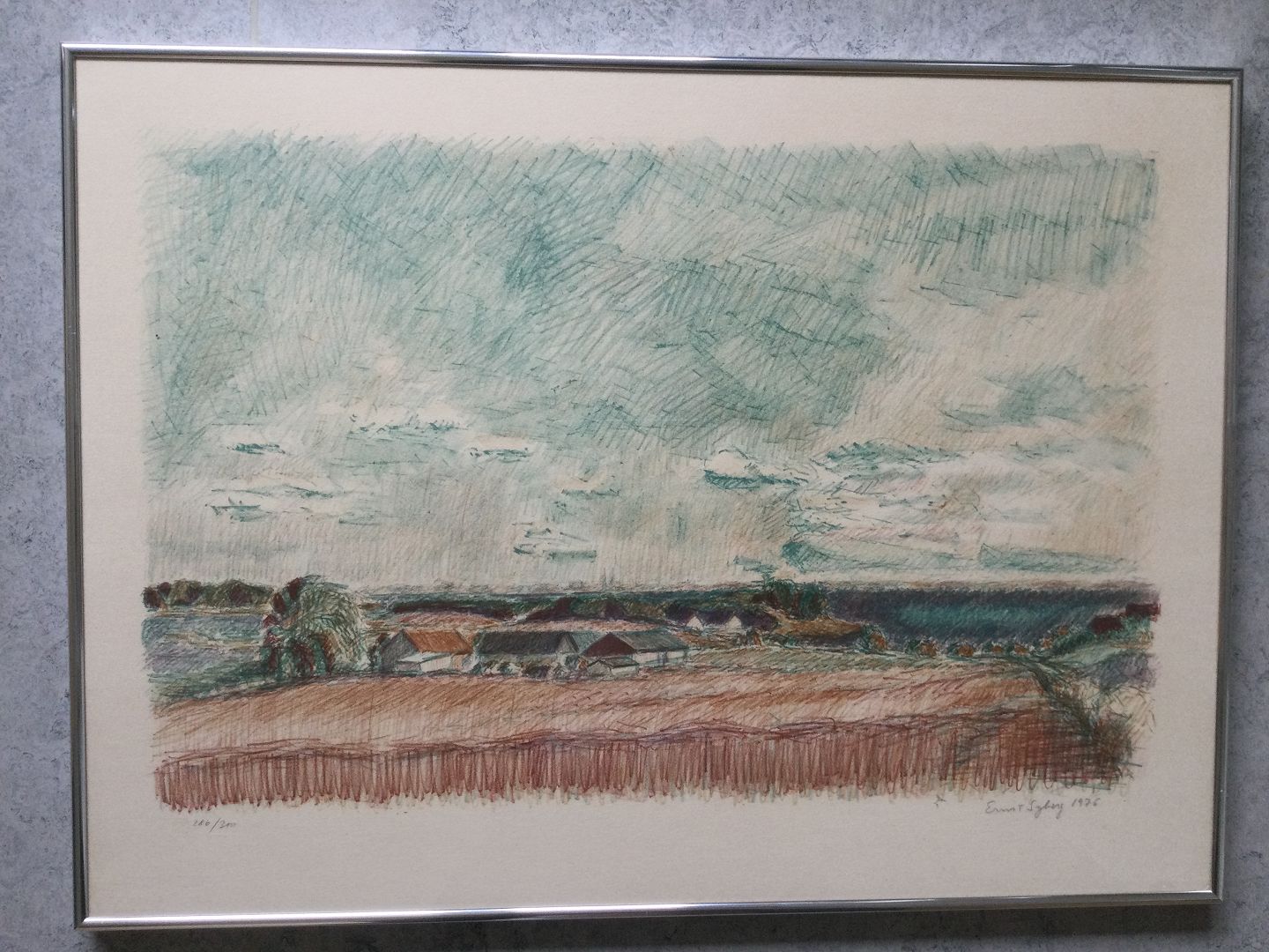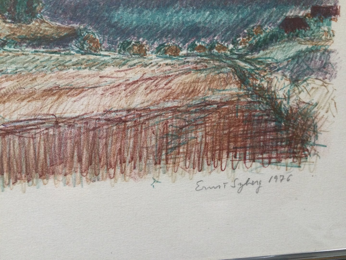 Farvelitografi af Ernst Syberg 1976 - Landskab med huse