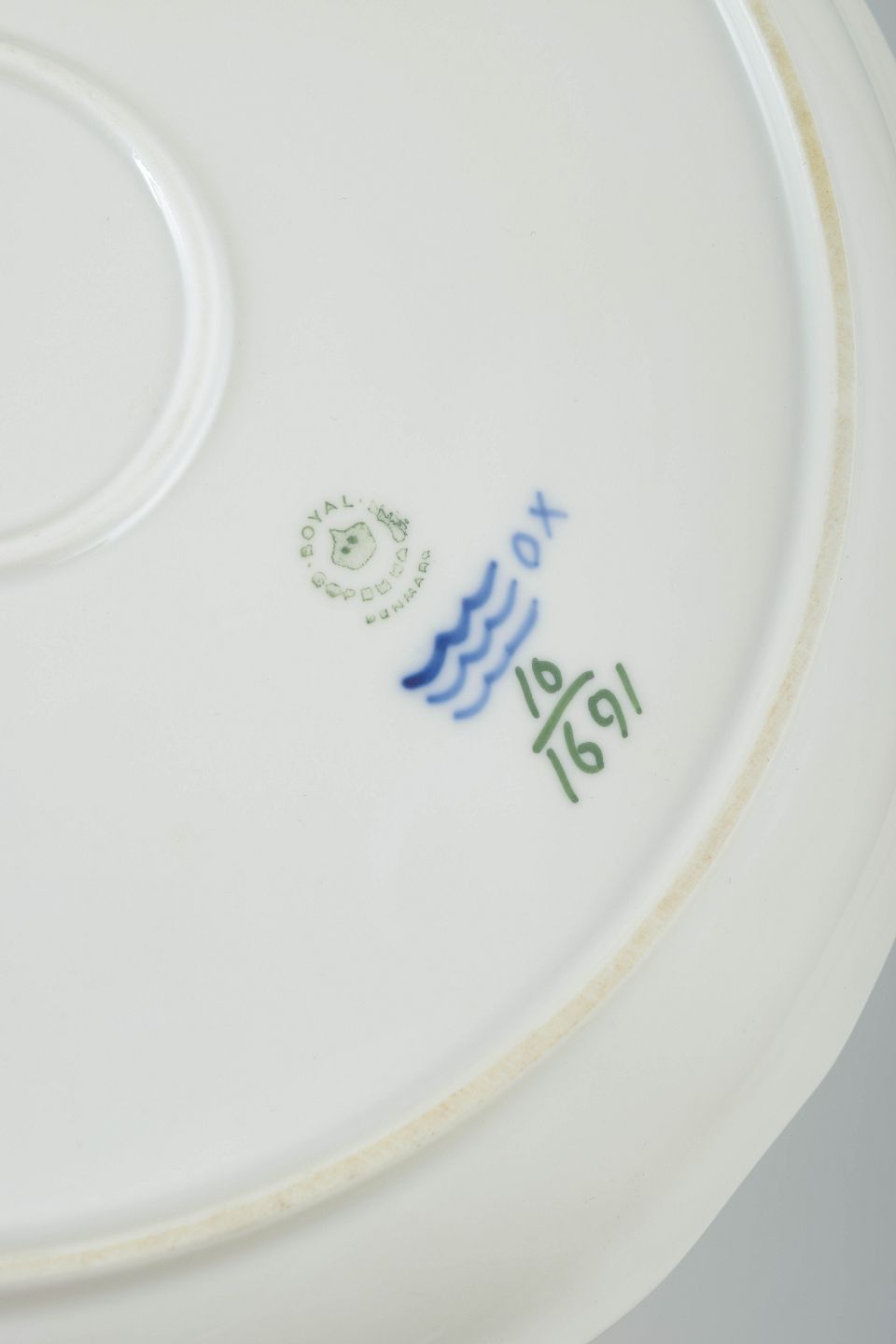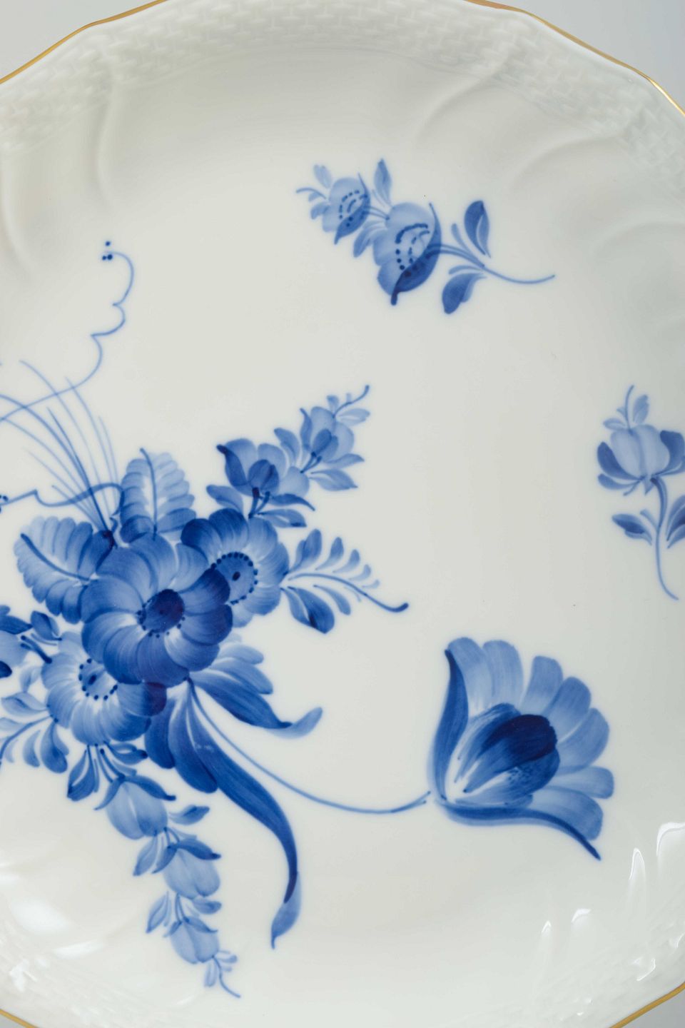 Royal Copenhagen blev grundlagt i 1775 og er i dag en af verdens mest anerkendte porcelænsfabrikker. Mønsteret “Blå Blomst” blev introduceret i slutningen af 1700-tallet som et frit blomsterdekor, inspireret af europæisk rokoko. Serien blev produceret i flere varianter: Svejfet, Flettet og Kantet. De sjældne udgaver med guldkant blev typisk udført til særlige bestillinger og udgør i dag nogle af de mest eftertragtede variationer inden for Royal Copenhagen porcelæn.