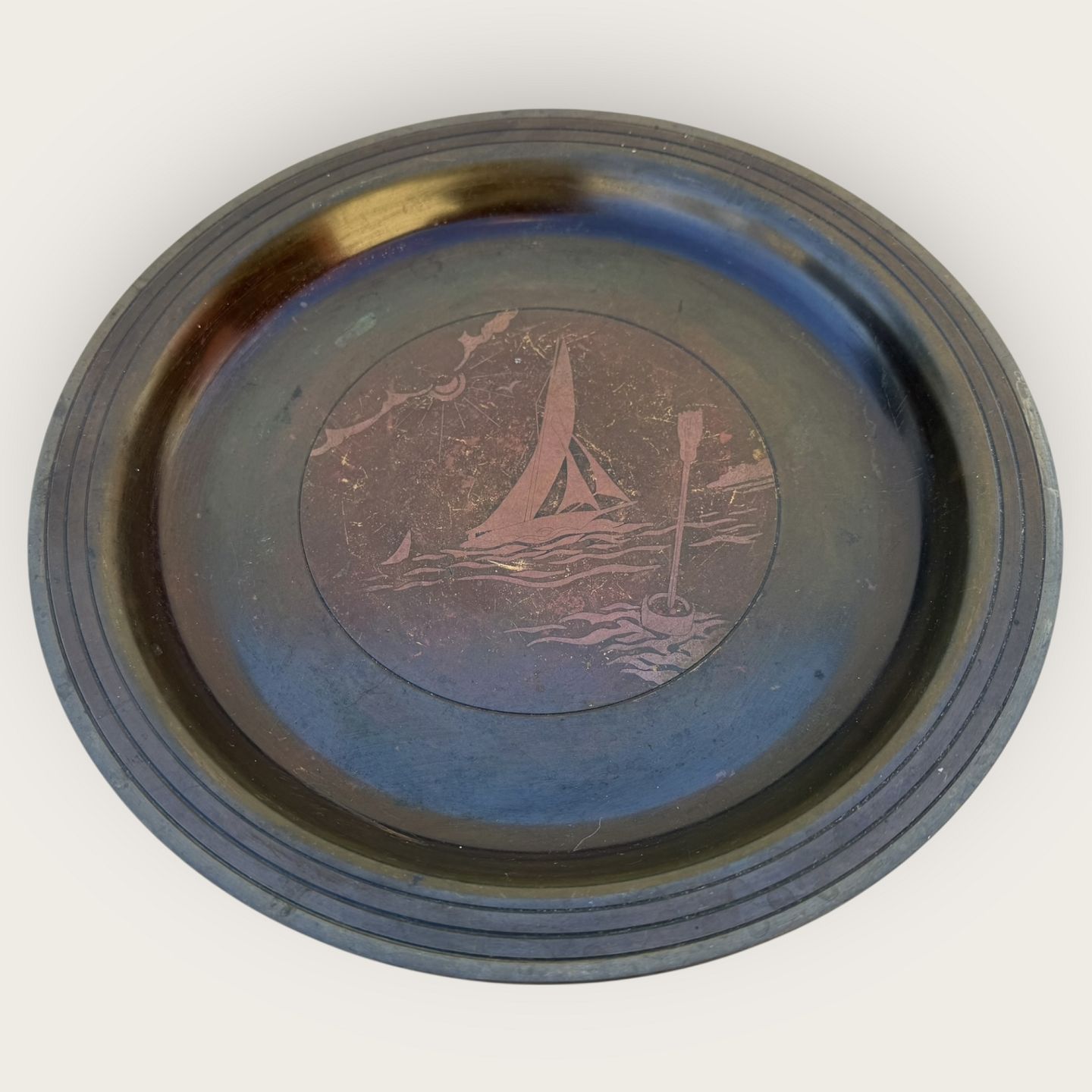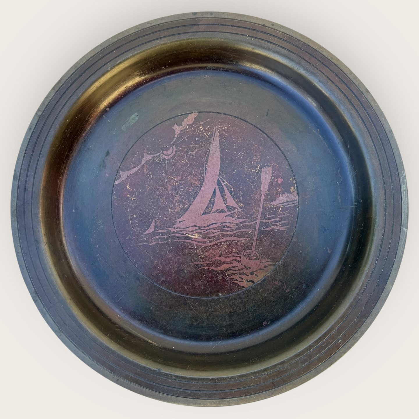 Bronze fad med skibsmotiv