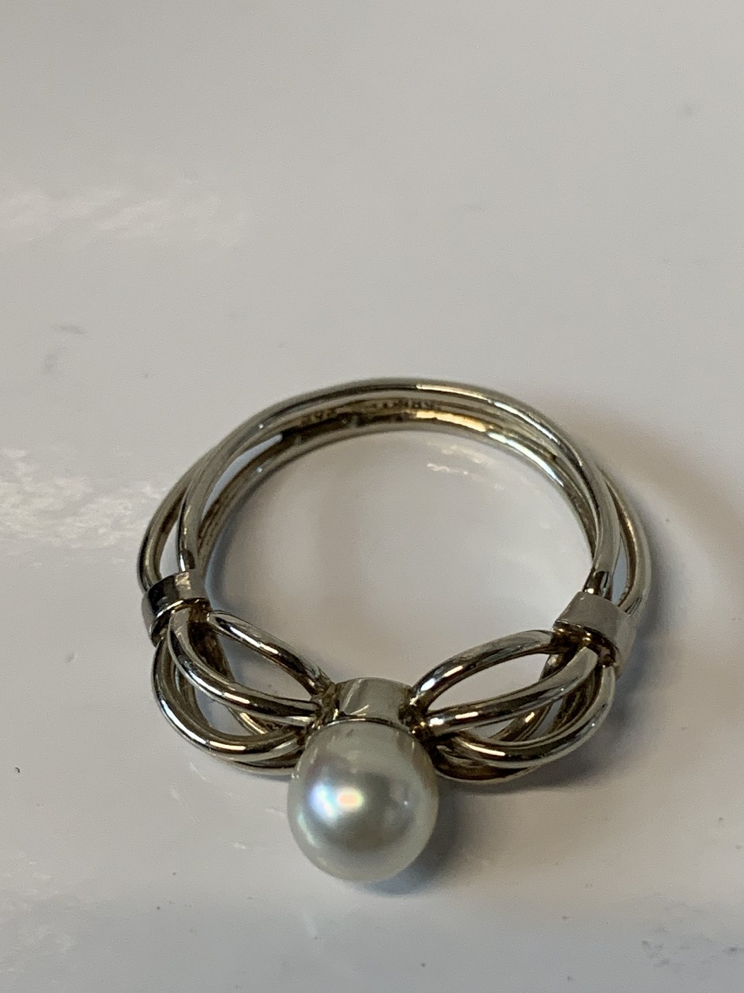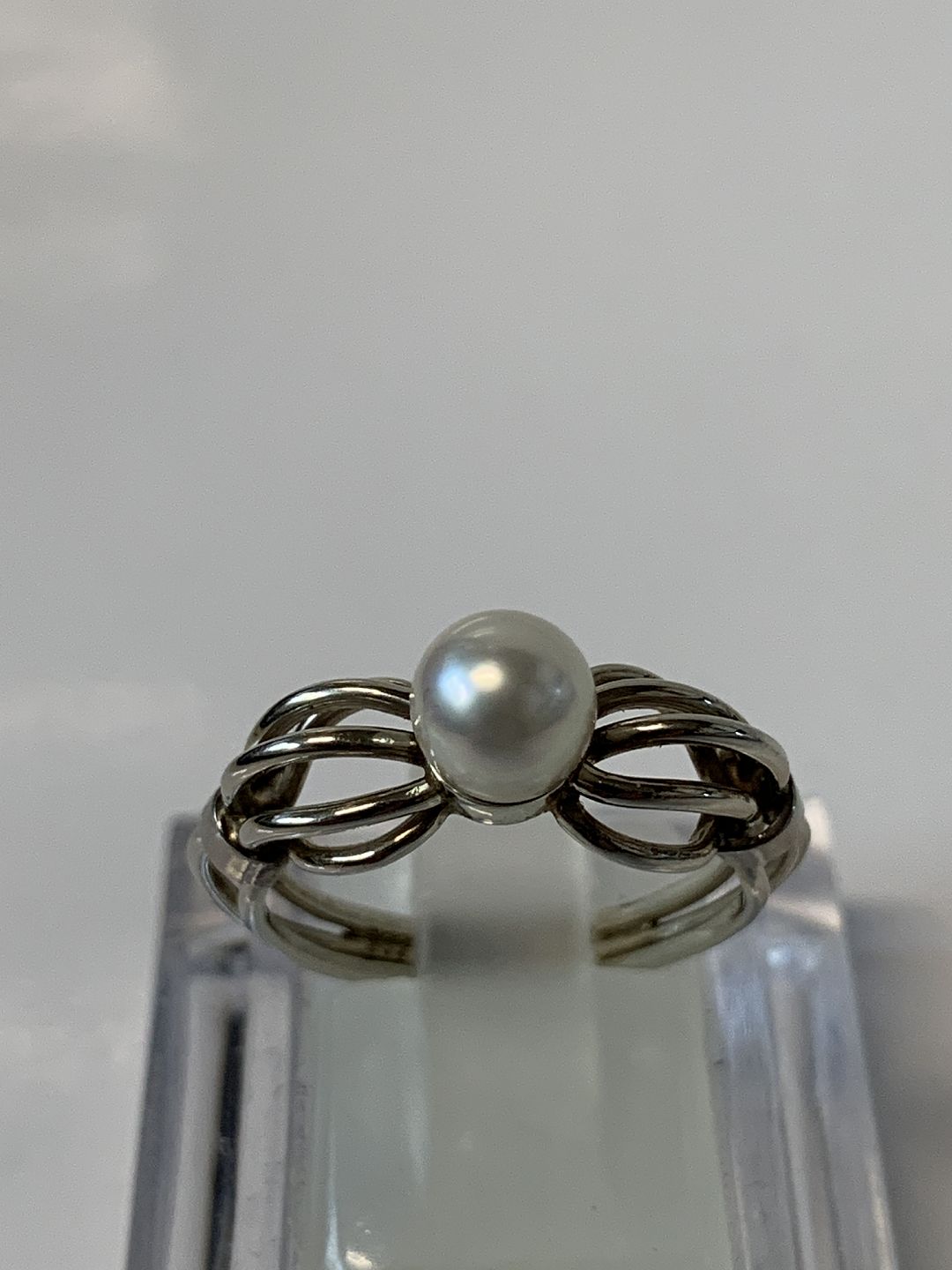 Elegant Damering i 14 karat hvidguld, med indlagt perle.