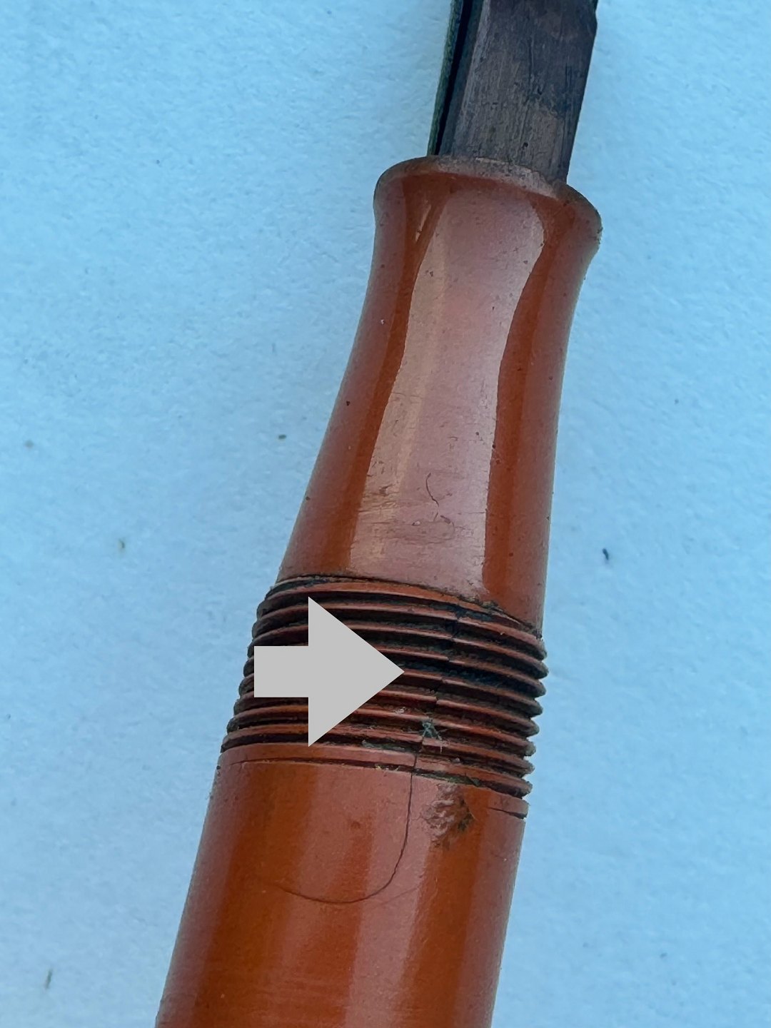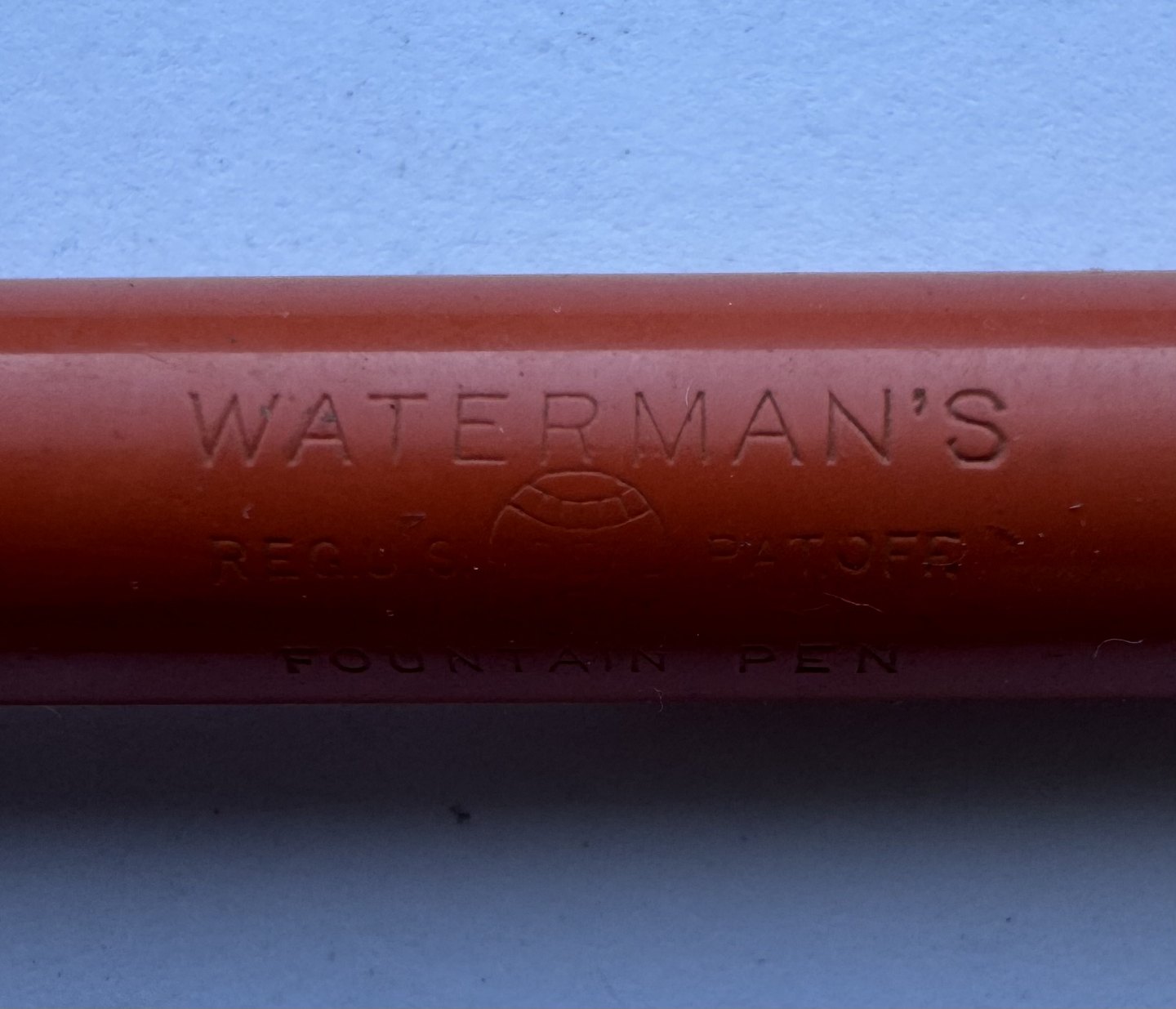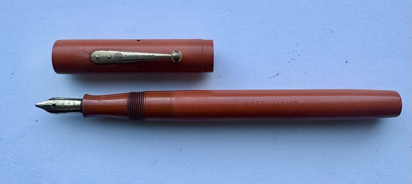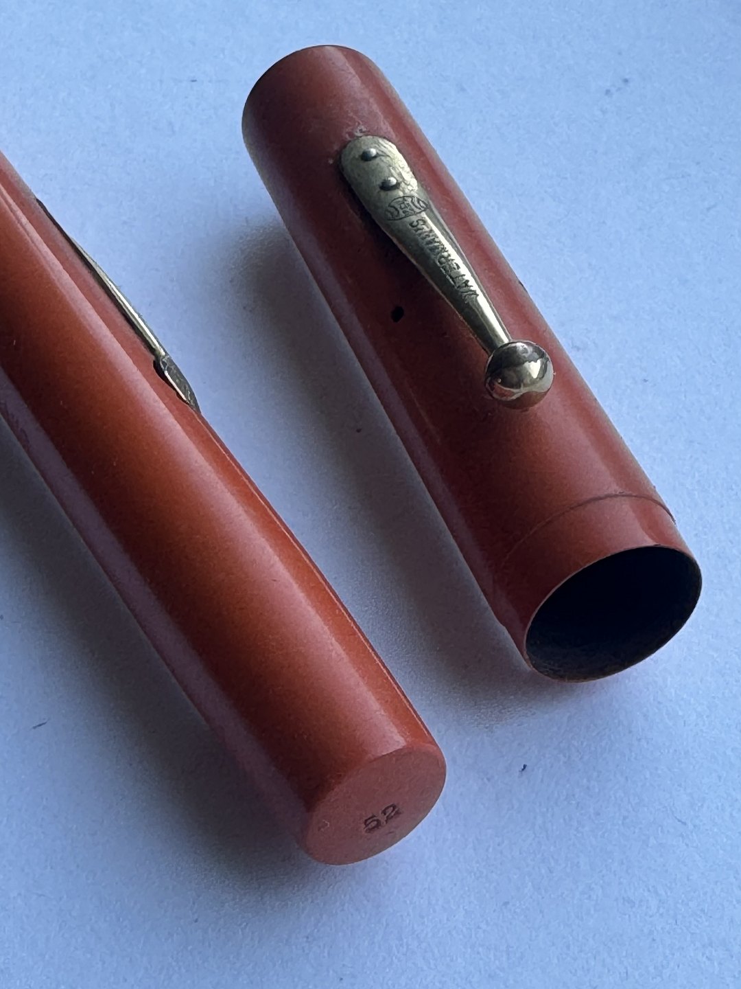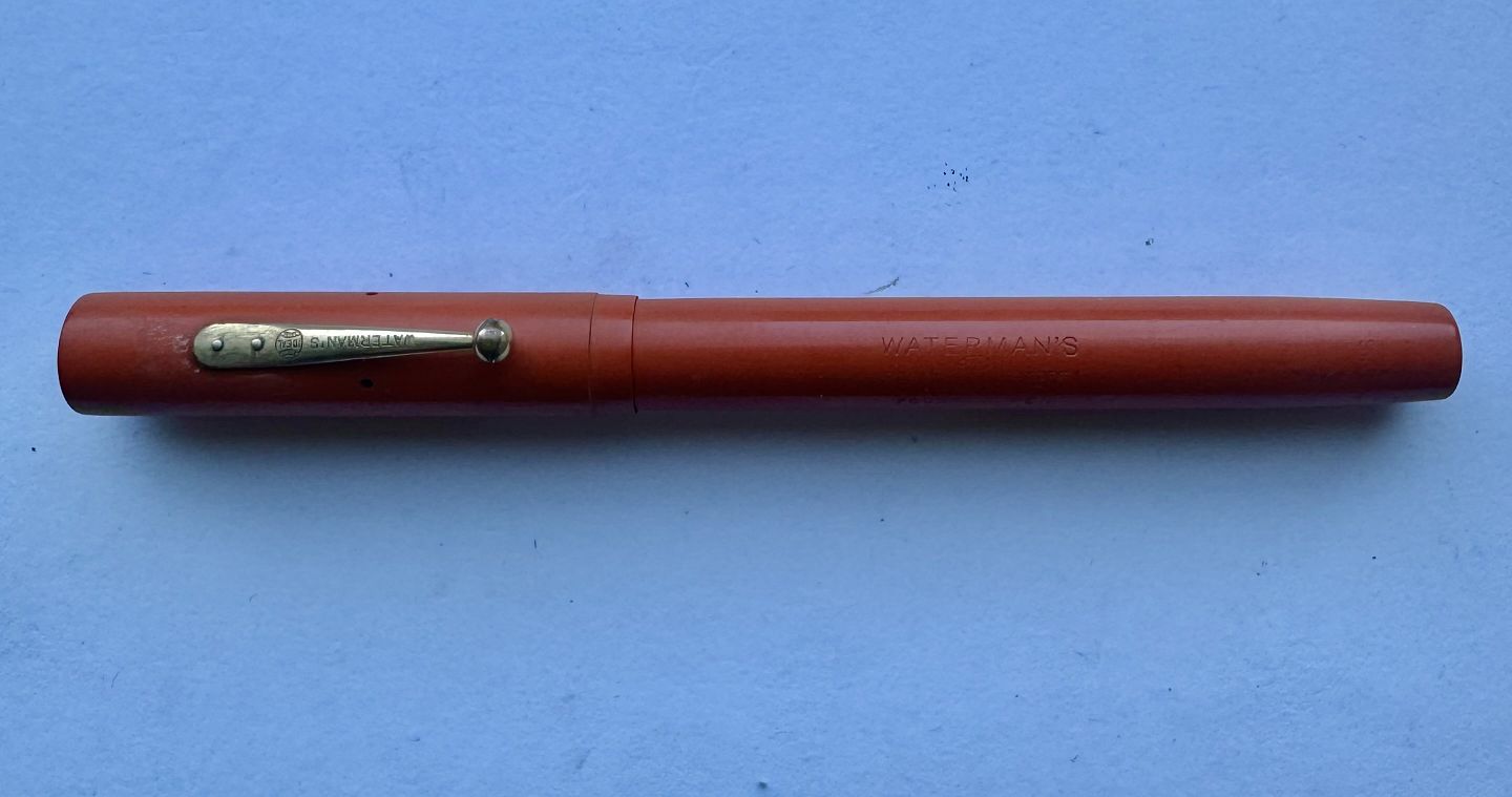 Koralrød Waterman nr. 52 fyldepen med leverfiller. FEJL: Mavebælte på hætten mangler og der er en revne henover “tråden” på pennens krop (se foto med den grå pil). Mål: 13,5 cm lang.