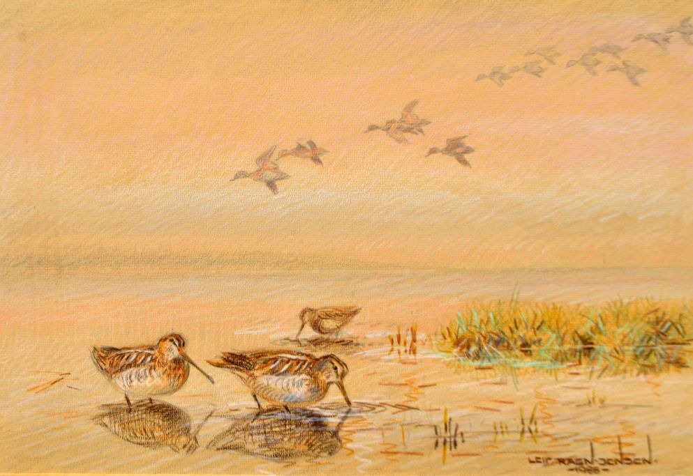 Ragn-Jensen, Leif (1911 - 1993) Danmark: Fugle ved havet. Pastel på papir. Signeret 1988. 32 x 47 cm.