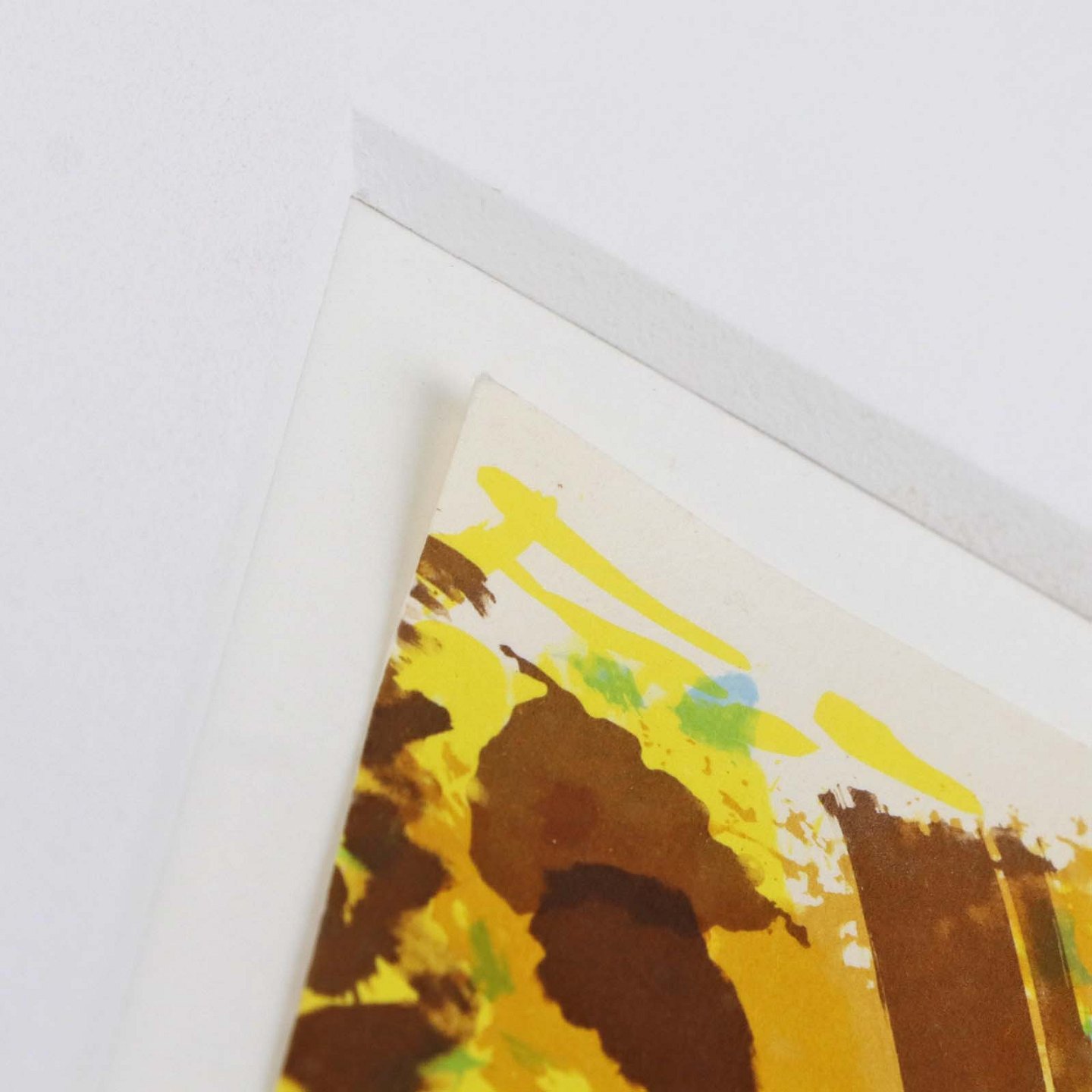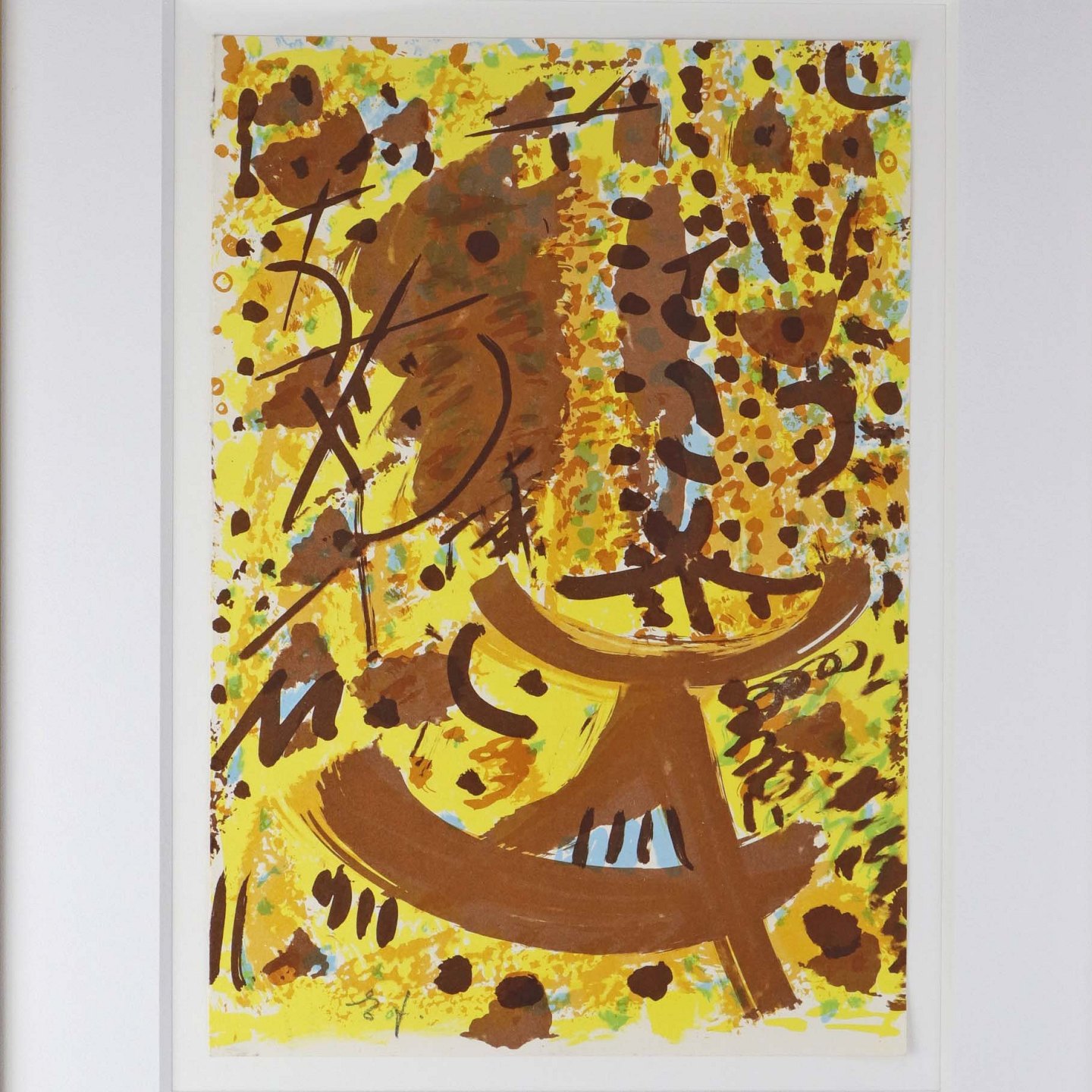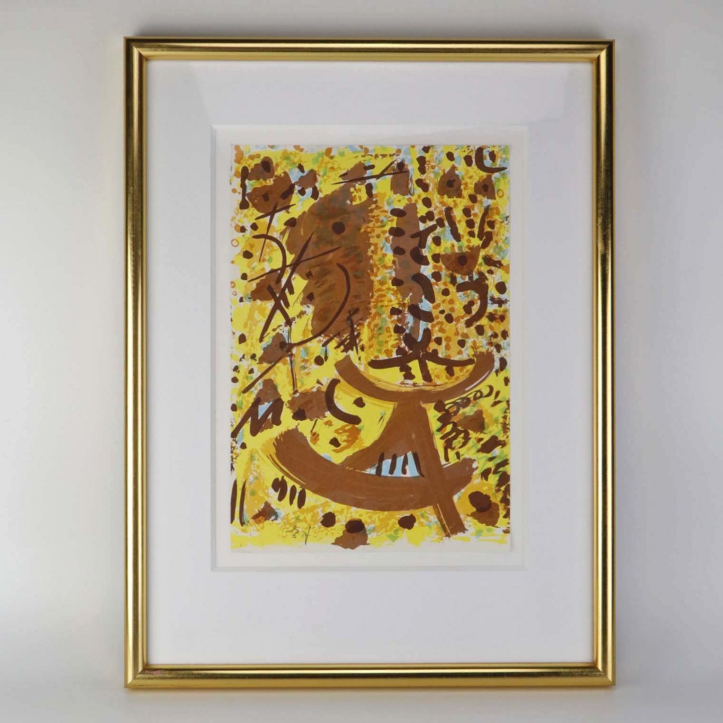 Indrammet litografi med passepartout i guldmalet træramme med abstrakt motiv i gule og brune farver. Litografiet er ikke nummereret.