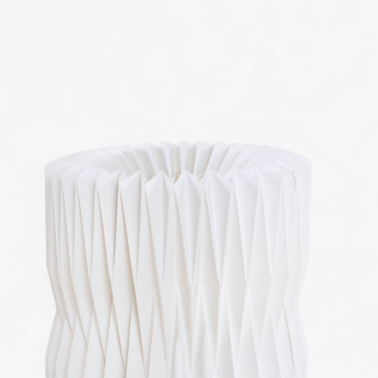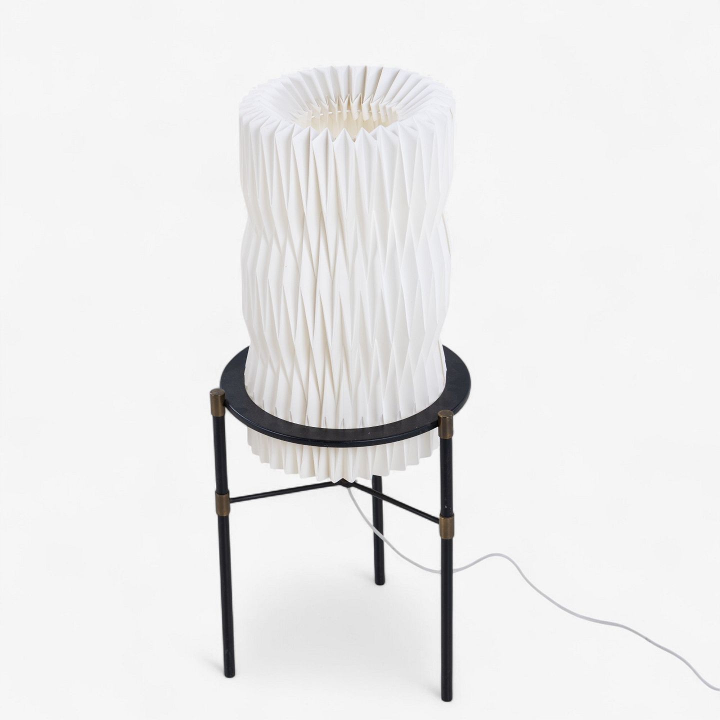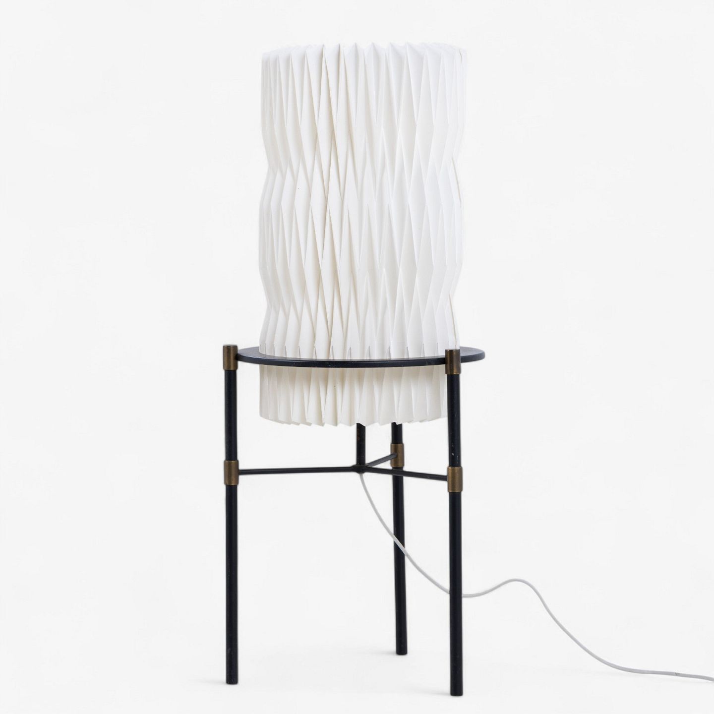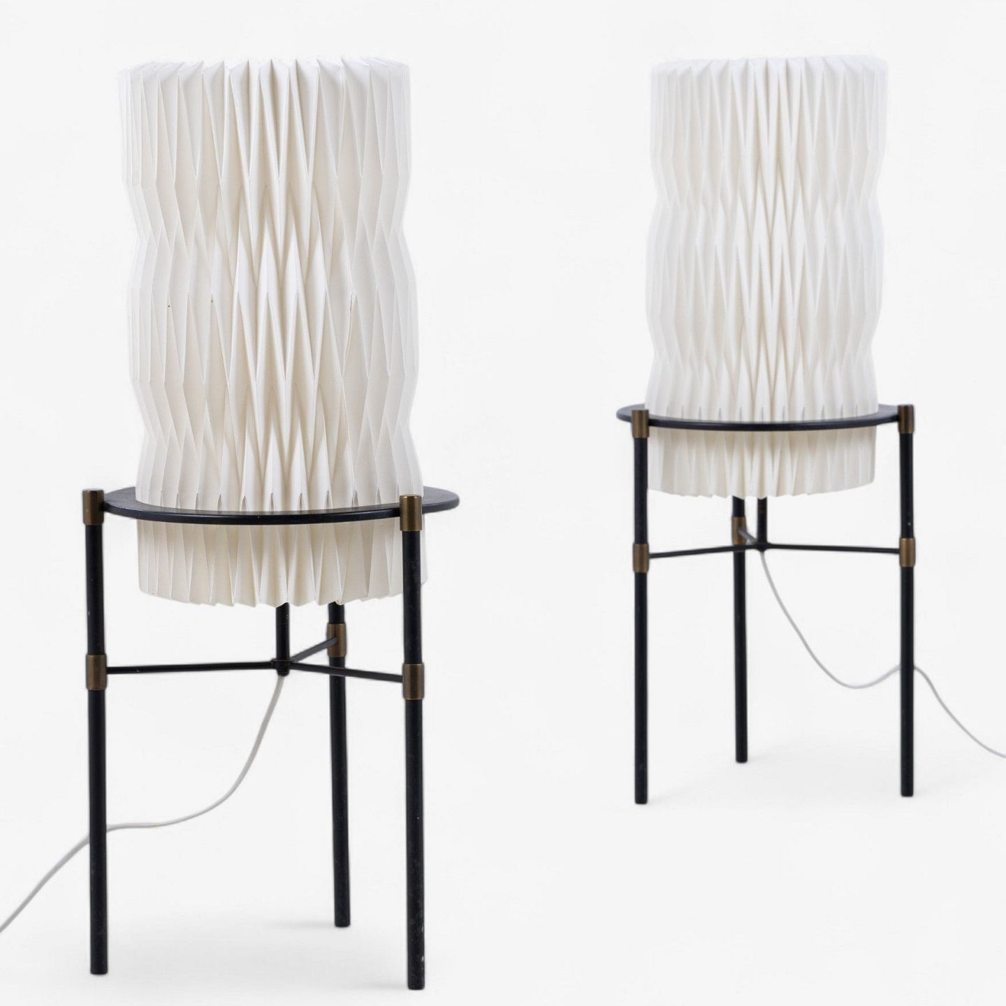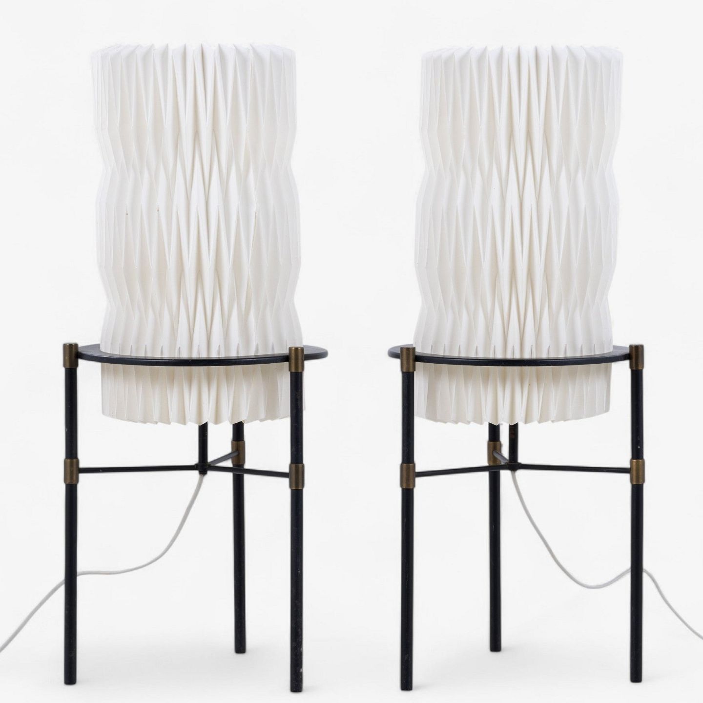 Par bordlamper på trepas fod i sortlakeret metal med hvide plisserede skærme.