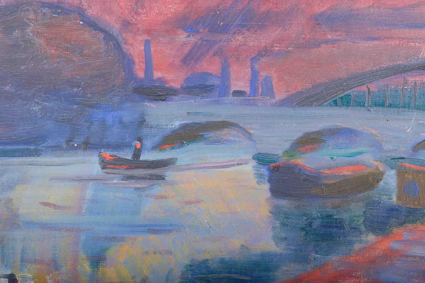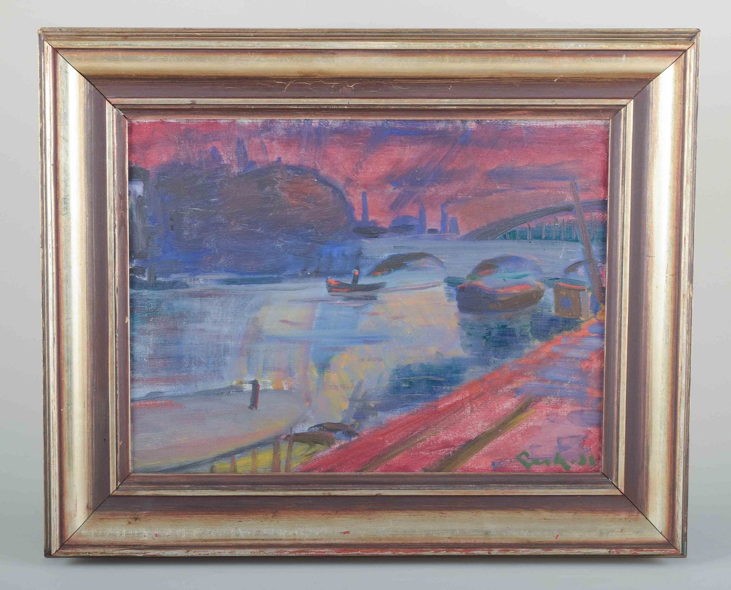 Et stemningsfuldt motiv af floden La Seine i Paris, udført af Gerhard Lundberg i 1938 med ekspressive penselstrøg og stærke farvetoner.