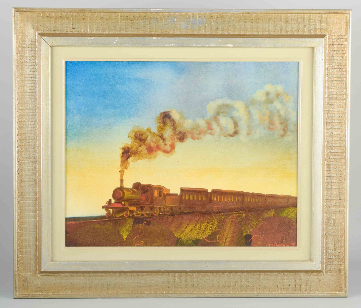 Et realistisk maleri af den svenske kunstner Mikael Kvarsebo, udført i 1984. Motivet viser et damplokomotiv i landskabet med dramatisk røg mod en klar himmel, malet i en detaljeret, naturalistisk stil.