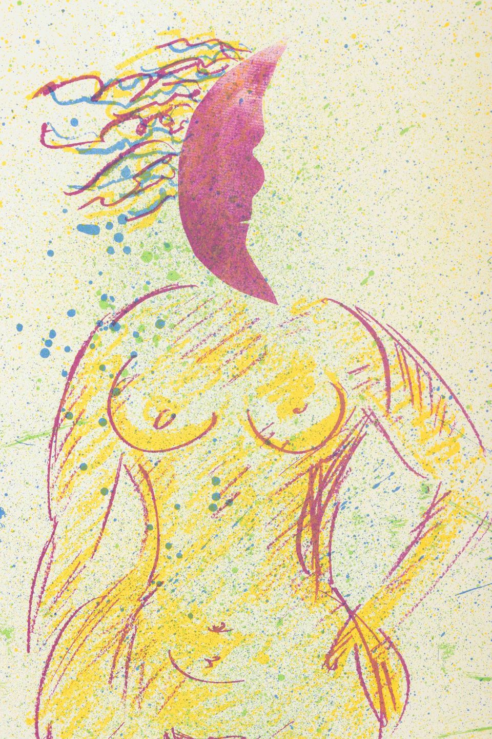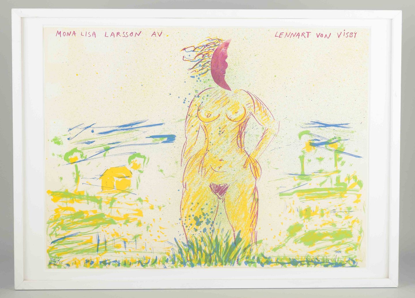 Et ekspressivt og surrealistisk litografi af den svensk-franske kunstner Erik Dietman, kendt for sin fabulerende og humoristiske billedverden. I dette værk præsenteres en kraftfuld, stiliseret kvindeskikkelse i et farverigt og legende landskab. Dietmans brug af stærke kontraster, poesi og ironiske referencer skaber et værk, der både hylder og udfordrer klassiske kunsthistoriske idealer.