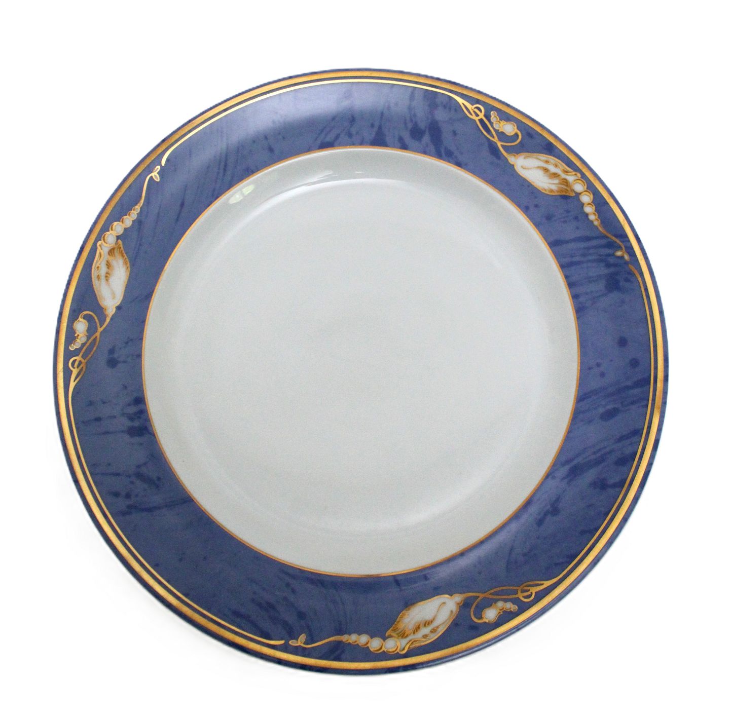 Royal Copenhagen, Blå Magnolia. Dækketallerken eller megastor middagstallerken. Blå marmoreret bort dekoreret med gylden blomsterknop. Designet af Flemming Eskildsen. Nr. 631. Diameter 31,5 cm. I. sortering. Flot stand. Pris: 300 kr. stk. Lager: 16