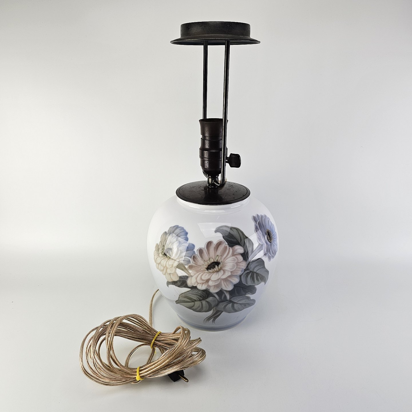 Bordlampe i hvidt porcelæn med dekoration af blomster og sommerfugle, og fatning i sort metal