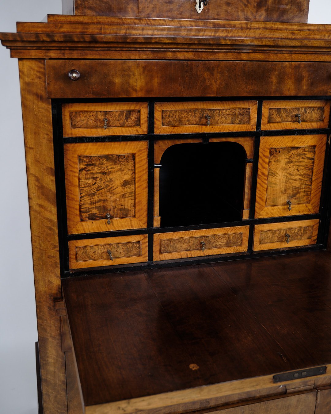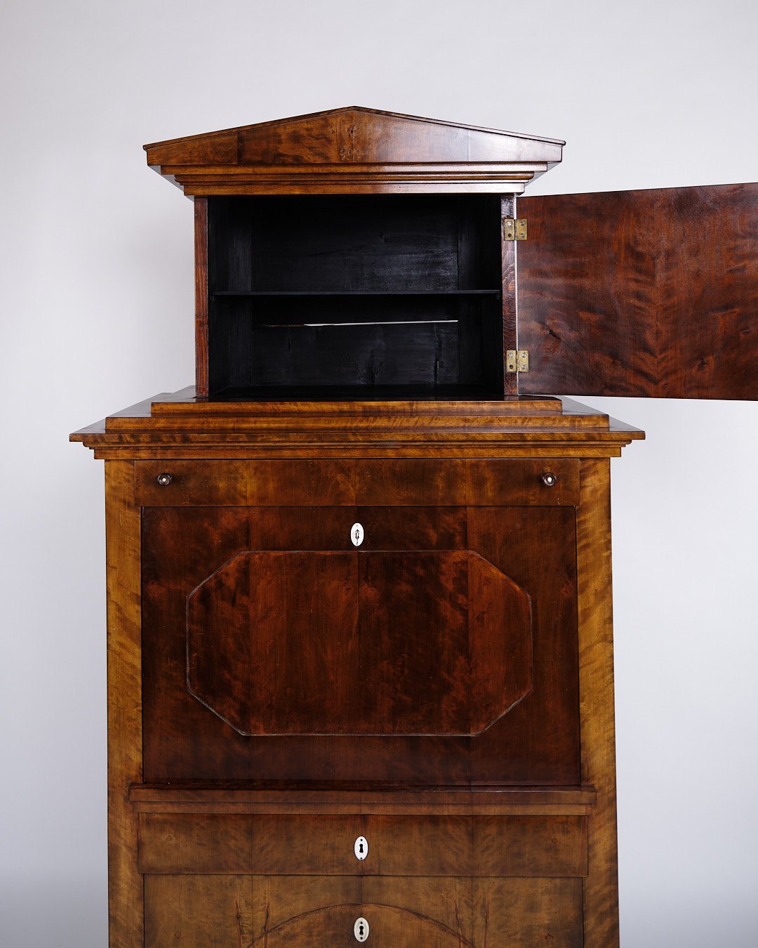 antik sekretær fra 1840’erne, udført i håndpoleret birketræ med smukke intarsia-detaljer. Møblet er indrettet med to skuffer og fremstår som et fint eksempel på 1800-tallets klassiske snedkerhåndværk, hvor funktionalitet og dekorativt udtryk blev forenet.
