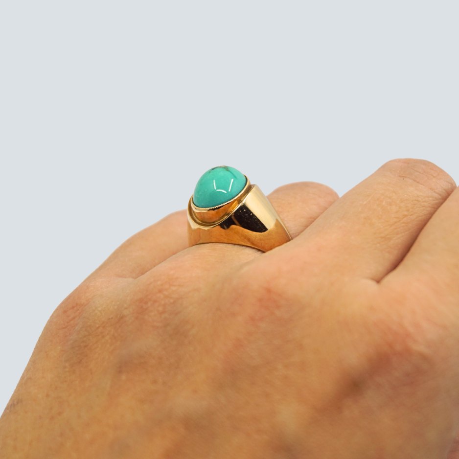 Ring i 14 kt. guld med oval turkis. Ca. 1970.