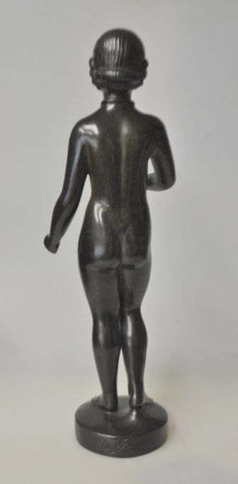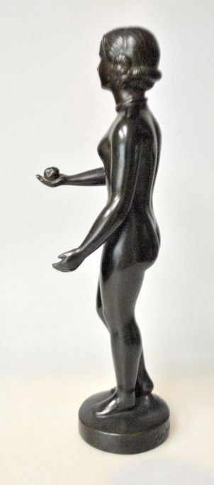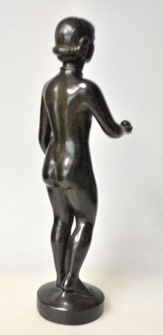 Andersen, Just (1884 - 1943) Danmark: Figur, Ydun. No. D 2307. Patineret discometal. Signeret. H: 29 cm. 1, gang produceret 1942. Ifølge nordisk mytologi var hun gudinde for evig ungdom og vogter af de foryngede gyldne æbler. Perfekt stand!
