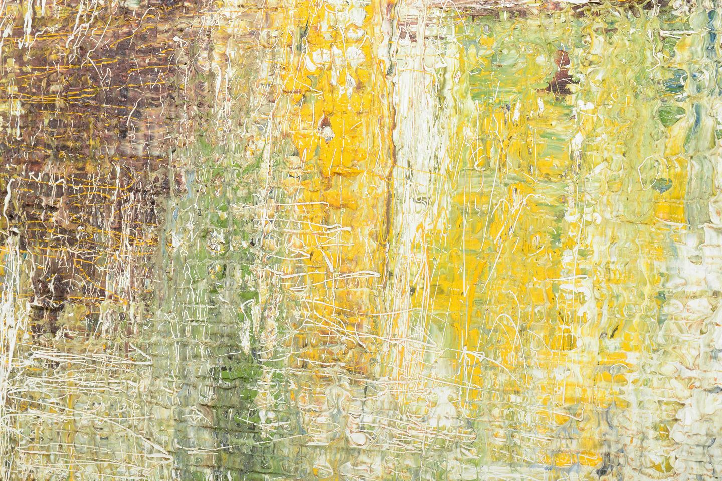 Et ekspressivt, koloristisk maleri med kraftige penselstrøg i gule, grønne, brune og blå nuancer, der danner en struktureret, næsten rytmisk abstrakt overflade.