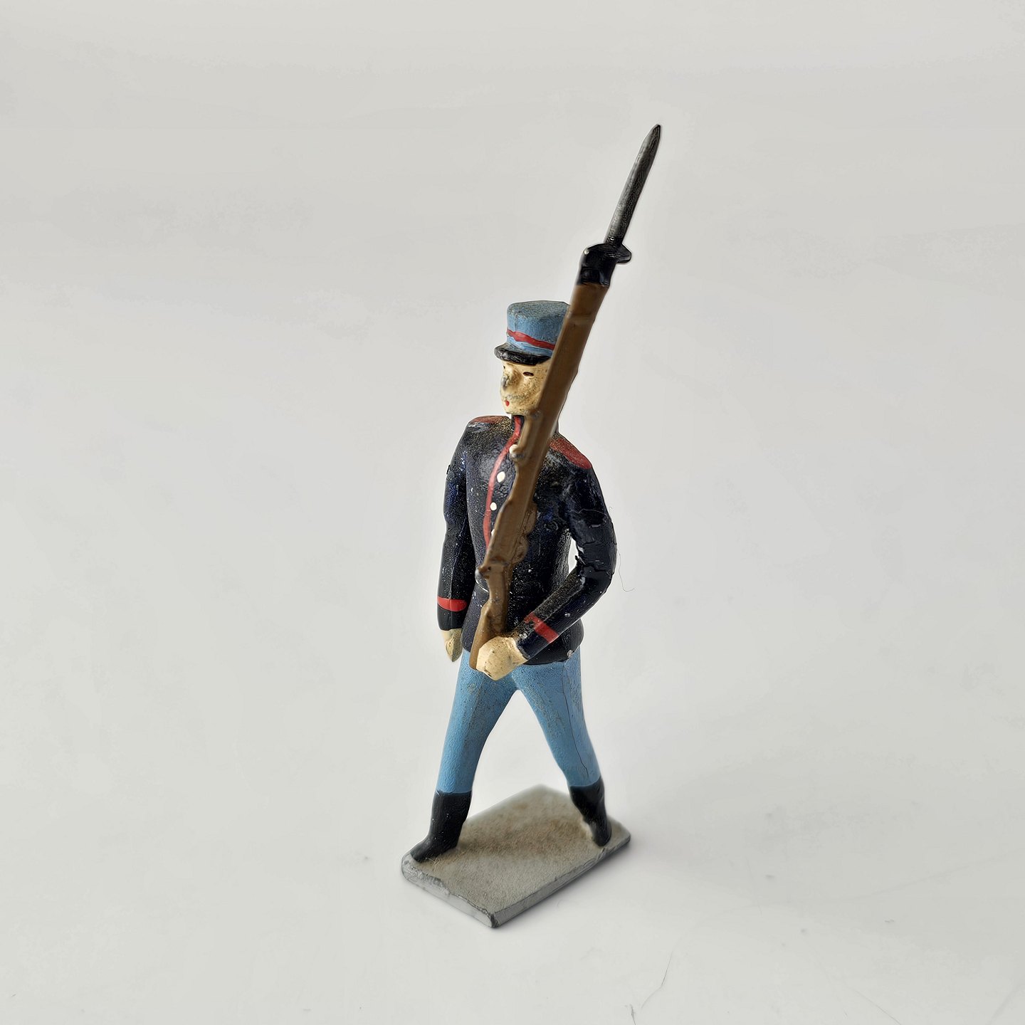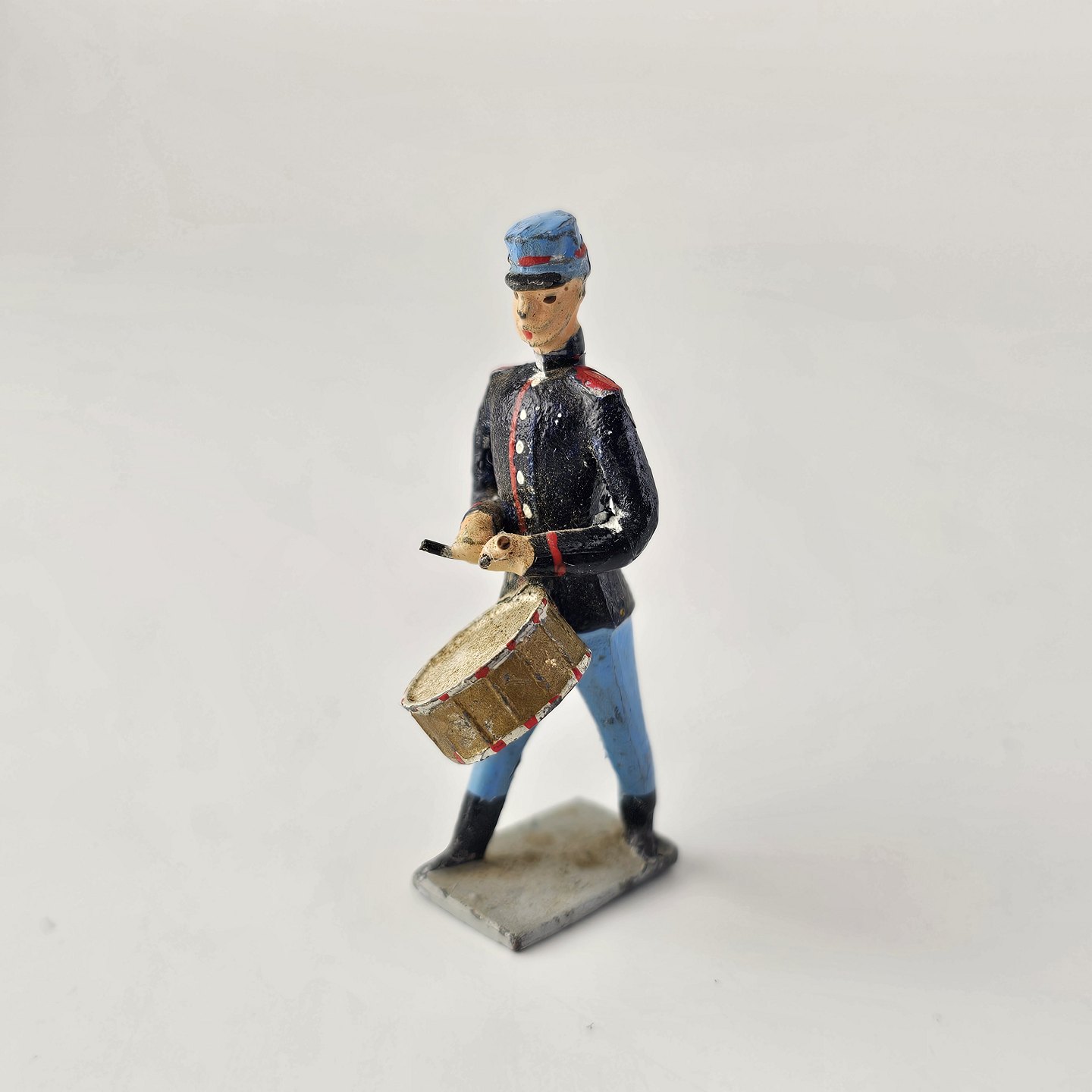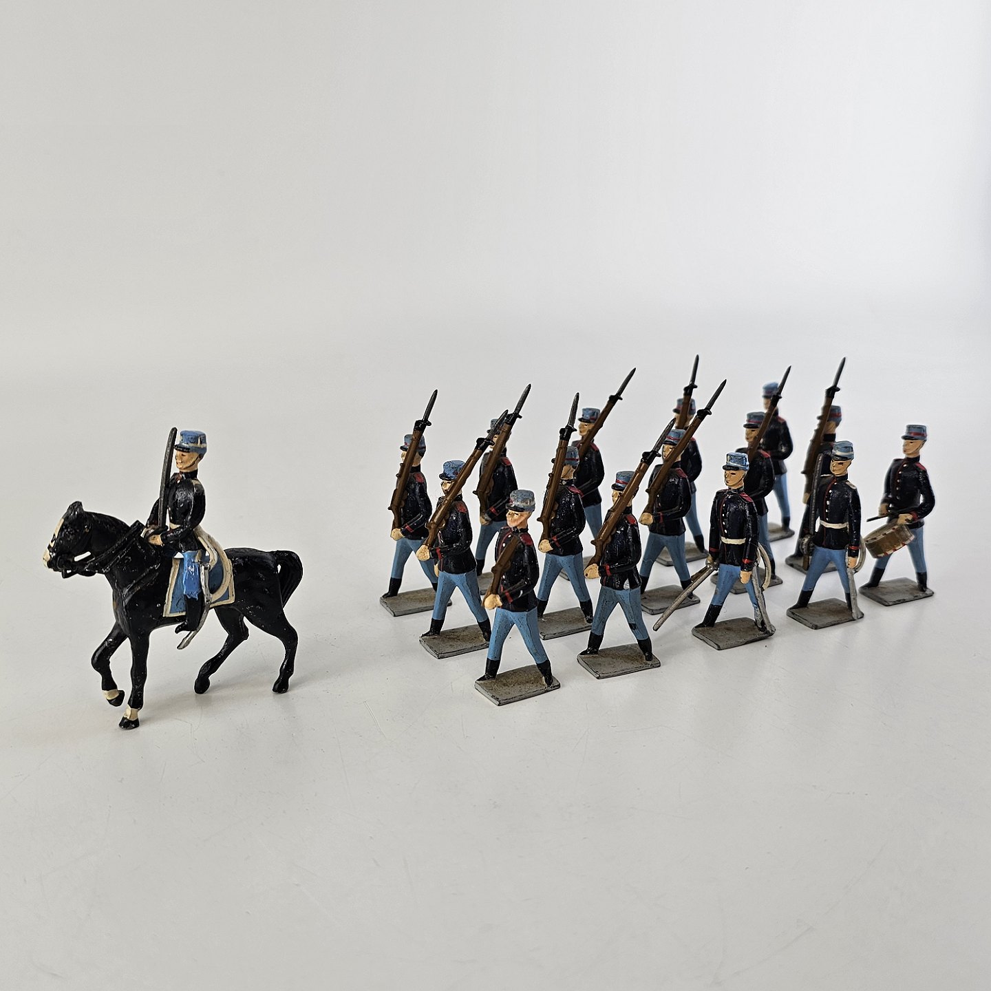 Fem figurer af soldater i tin, én til hest og 15 fodfolk med trommer eller våben