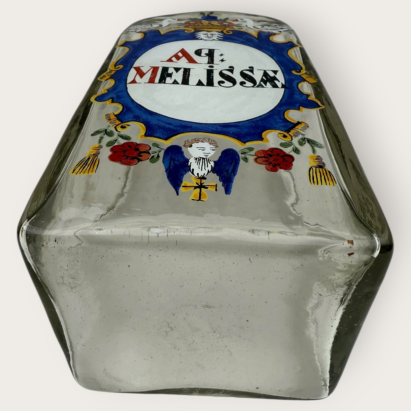 Holmegaard apotekerflaske fra 1986, AP Melissæ, Mål: 23x10x9cm, flaskerne er mundblæste kopier af originale gamle apotekerflasker, Signeret Hg86.