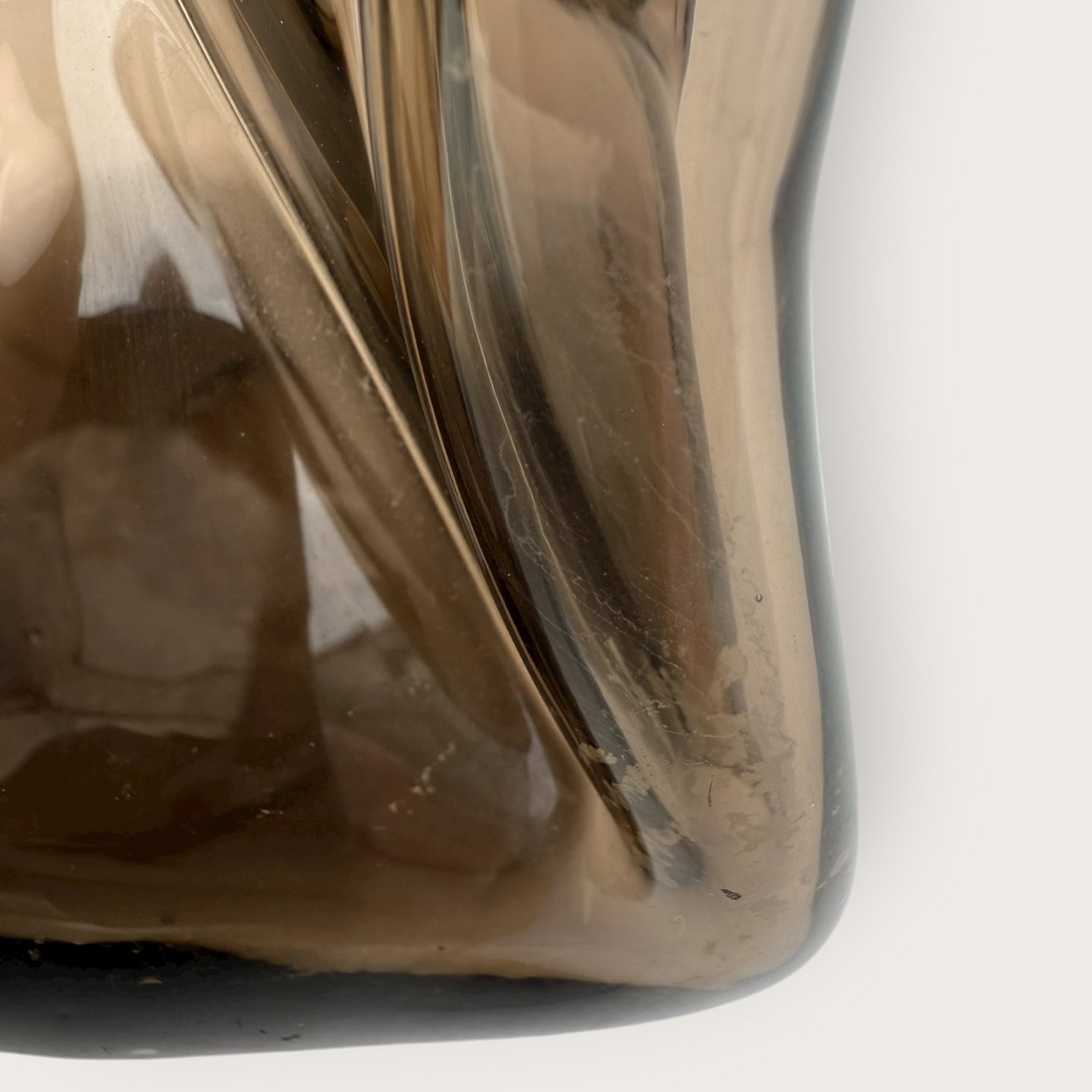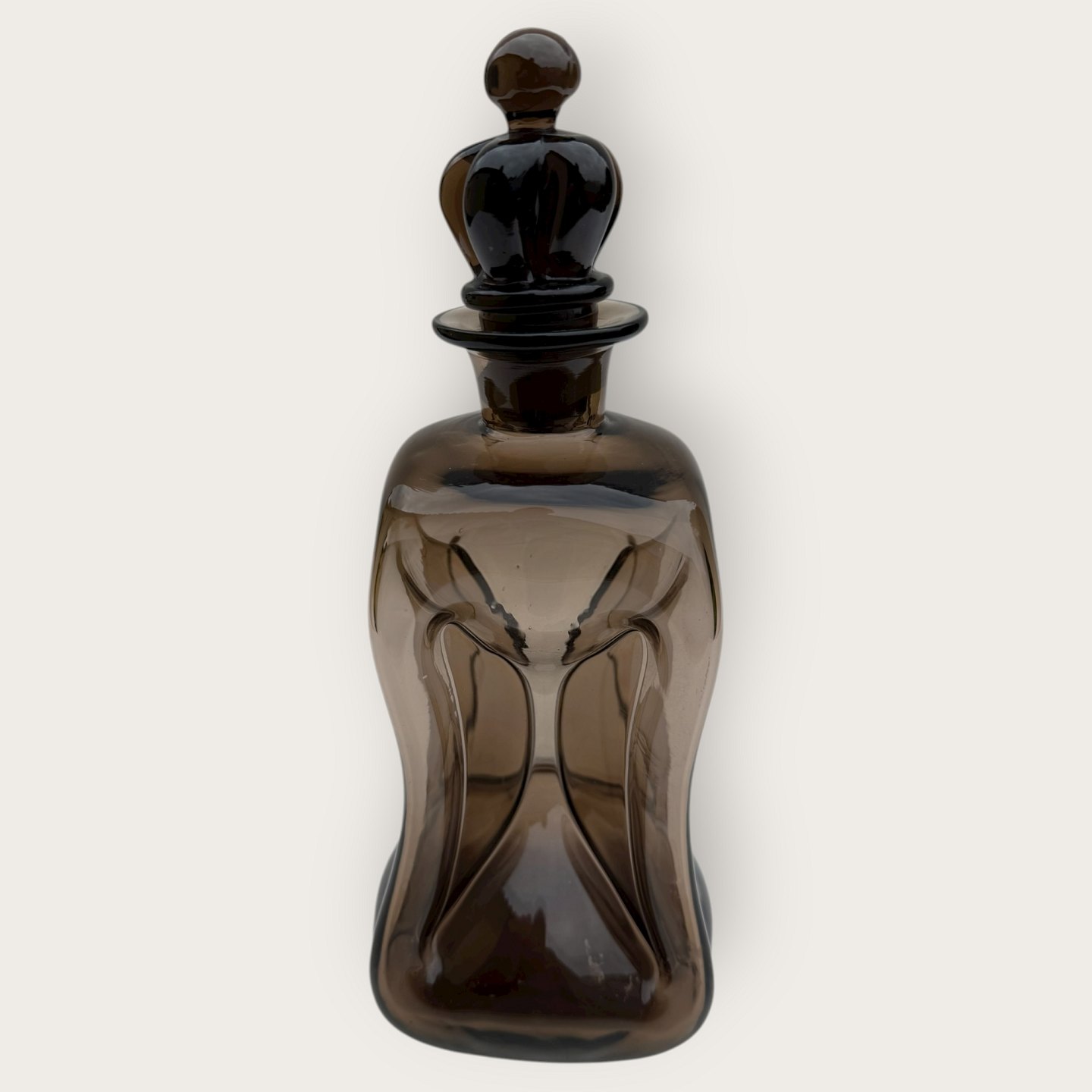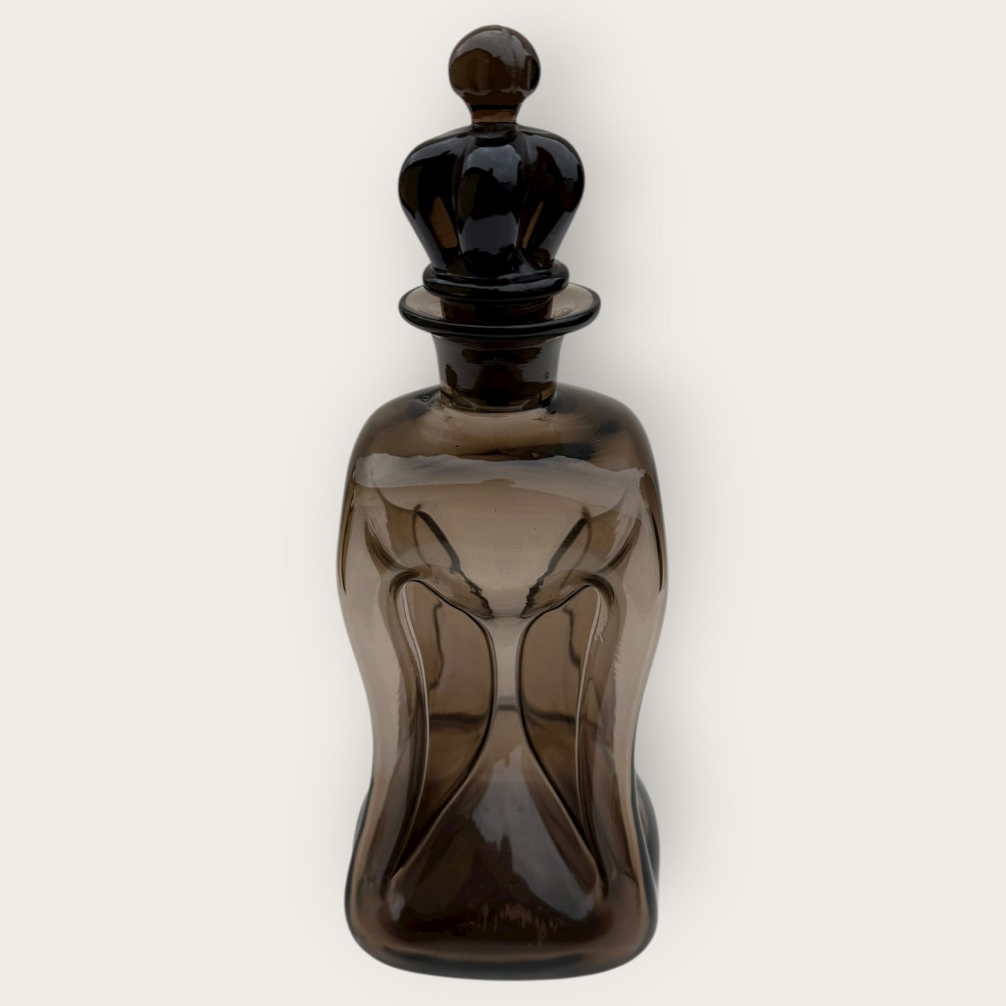 Holmegaard, klukflaske i brunt glas og med krone prop, Lille smule urenhed indvendigt i bunden ellers pæn stand, Mål: 26x10x10cm