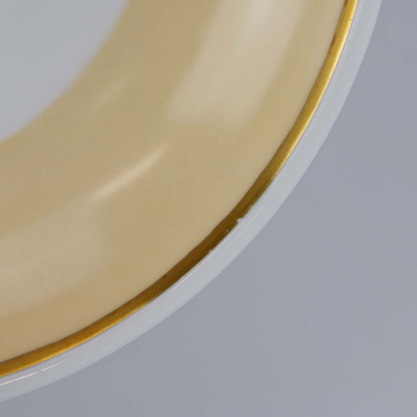 Service i glat hvid porcelæn med sandfarvet dekoration og gylden kant.