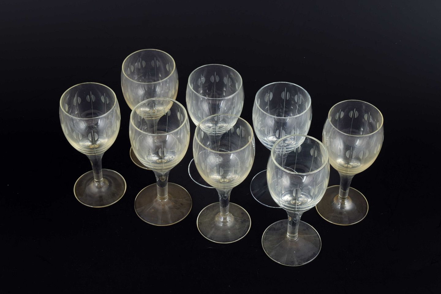 Mundblæste glas med kort stilk og høj, slank bowle. Dekoreret med indgraveret mønster i form af lodrette linjer med ovale elementer.