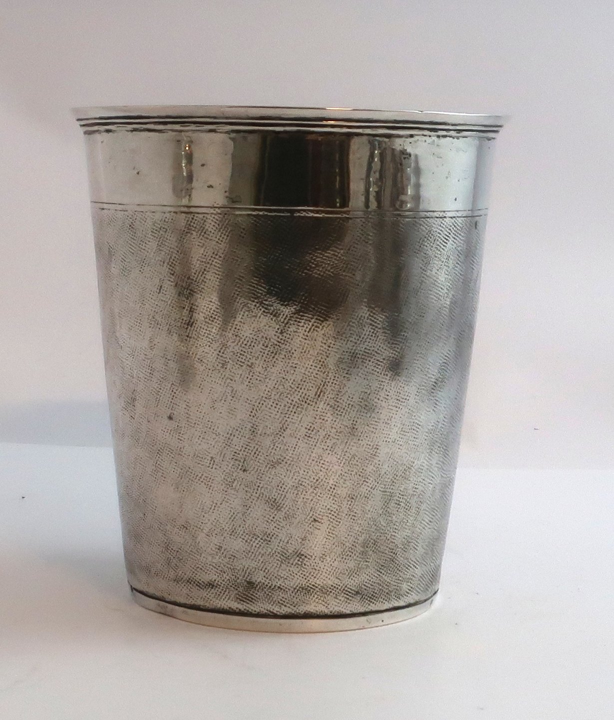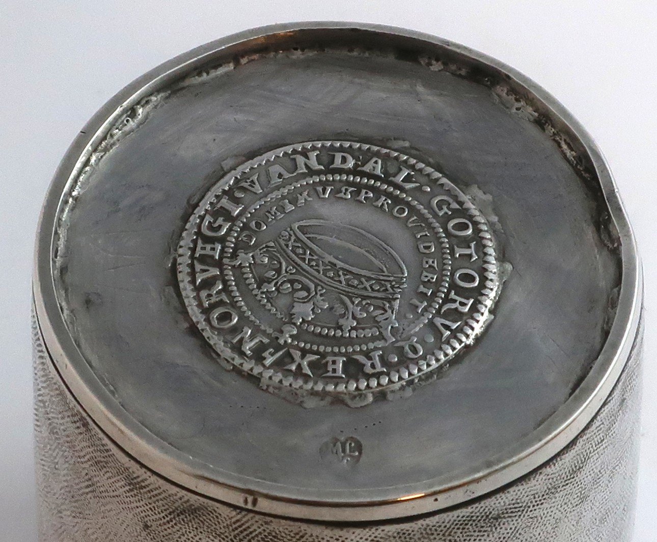 Mogens Thommesen Løwenhertz (1669-1734). Stort sølv bæger. Mønt (Frederik lll krone fra 1651) isat i bunden. Højde 11,5 cm. Diameter 10 cm.