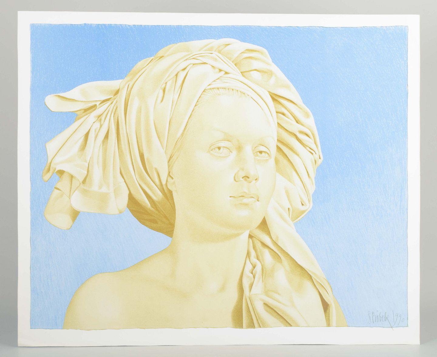 Et naturalistisk og minutiøst udført portræt af en kvinde med hovedklæde, sat mod en klar blå baggrund. Værket bærer Strøbeks karakteristiske superrealistiske stil, inspireret af 1600-tallets trompe-l’œil, hvor præcision og illusion skaber en nærmest fotografisk tilstedeværelse.